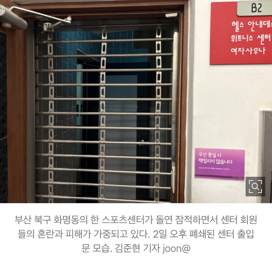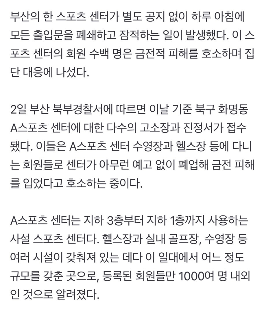 [여시뉴스데스크]부산 북구 스포츠센터 돌발 폐쇄… 피해 회원만 500명 이상 추정 작성자오매오매불망|작성시간25.12.02|조회수20,400 목록 댓글 11 글자크기 작게가 글자크기 크게가 출처: https://n.news.naver.com/article/082/0001356549?sid=102부산 북구 스포츠센터 돌발 폐쇄… 피해 회원만 500명 이상 추정부산의 한 스포츠 센터가 별도 공지 없이 하루 아침에 모든 출입문을 폐쇄하고 잠적하는 일이 발생했다. 이 스포츠 센터의 회원 수백 명은 금전적 피해를 호소하며 집단 대응에 나섰다. 2일 부산n.news.naver.com전문출처 다음검색 현재 게시글 추가 기능 열기 북마크 공유하기 신고 센터로 신고 댓글 댓글 11 댓글쓰기 답글쓰기 댓글 리스트 작성자해시해시 | 작성시간 25.12.02 헐 나도 작년까지 다녔는데... 작성자R=VD 부자된다 | 작성시간 25.12.02 와씨 여기가 그렇게됐다고...? 작성자티모시살라메 | 작성시간 25.12.02 지스포츠 수영장다닐랫든데...ㅁㅊ 작성자쓰레기에 이름 적어놨냐? | 작성시간 25.12.02 헉..? 내친구가 다니던 센터잖아...? 작성자오이싫어하는여시 | 작성시간 25.12.04 지스포츠...! 댓글 전체보기