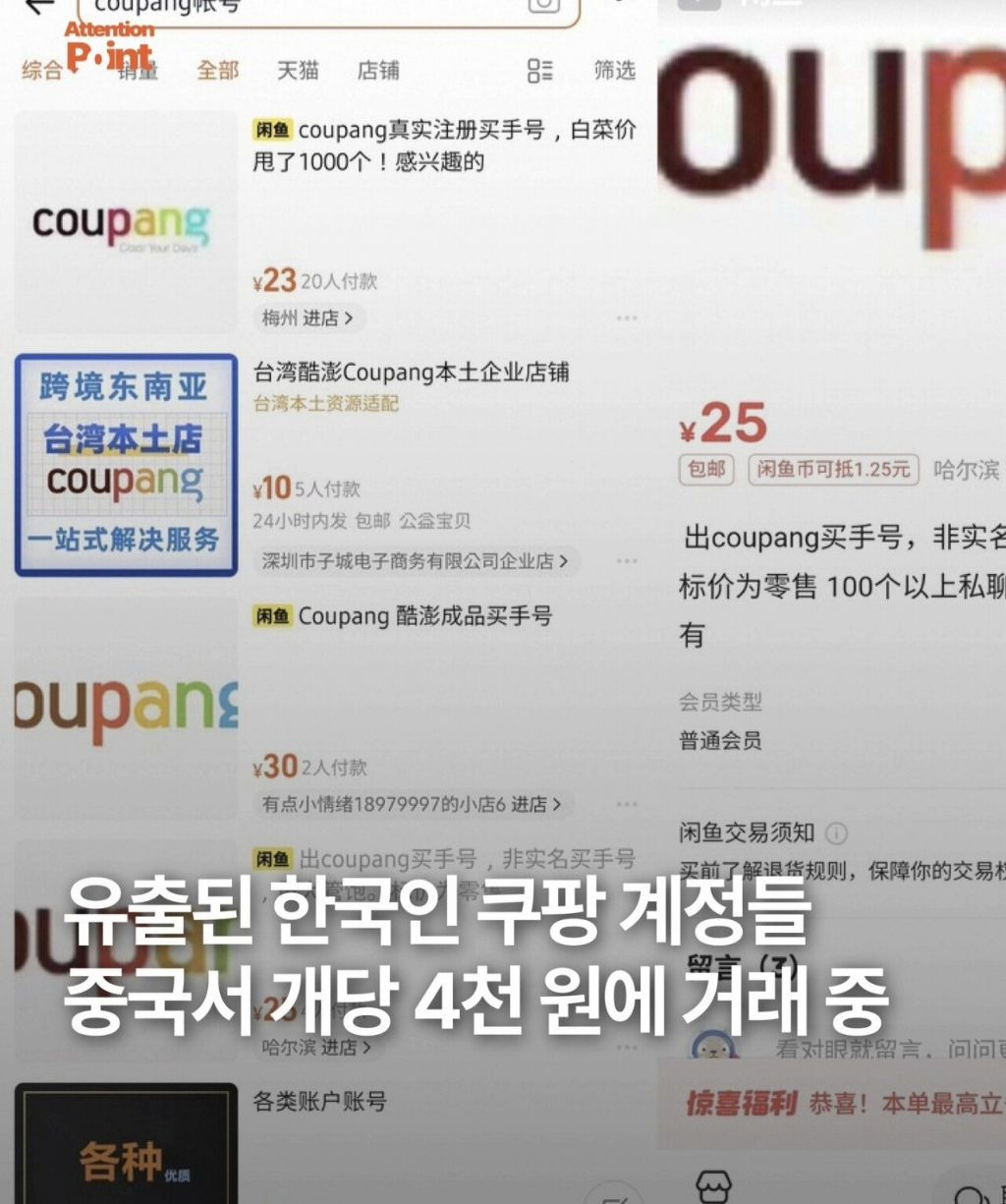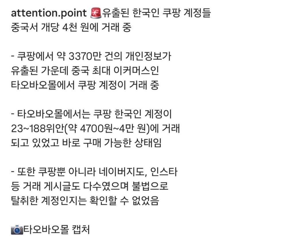 [스크랩] [기타]유출된 한국인 쿠팡 계정들 중국서 개당 4천원에 거래 중 작성자올림샵|작성시간25.12.02|조회수115,405 목록 댓글 338 글자크기 작게가 글자크기 크게가 다음검색 스크랩 원문 : 이종격투기 현재 게시글 추가 기능 열기 북마크 공유하기 신고 센터로 신고 댓글 댓글 338 댓글쓰기 답글쓰기 댓글 리스트 작성자맨날입으로만로또사는여시 | 작성시간 25.12.06 그래도 아직 쿠팡 쓰는 사람들 많지 않음?? 작성자청개굴잉 | 작성시간 25.12.11 미쳤군 빨리 탈퇴해 여시들.. 작성자롱릐 | 작성시간 25.12.12 ㅅㅂ탈퇴햇음 싸가지없는것들 작성자꺄압 | 작성시간 25.12.13 쉬이발.. 작성자단발머리소녀 | 작성시간 25.12.14 아놔이앀ㅋㅋㅋㅋㅋㅋㅋ 아예 개인정보 거래 사이트가 있다니 기절초풍이다 진짜 댓글 전체보기