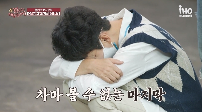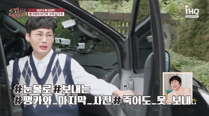 마지막으로 팽카와 사진을 찍은 팽현숙은 폐차하는 과정을 지켜보기도 했다. "내 팔다리가 떨어져나가는 것 같다"며 핸들과 발판 등을 챙기기도. 완전히 압축된 차를 보면서는 주저앉아 오열하는 모습을 보였다. (사진=채널 IHQ '결혼은 미친 짓이야' 캡처)