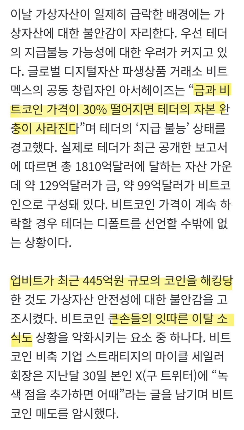 [스크랩] [여시뉴스데스크]테더 ‘지급 불능’ 상태 경고에… 가상자산 잇단 가격 급락세 작성자안나푸르나|작성시간25.12.02|조회수5,901 목록 댓글 6 글자크기 작게가 글자크기 크게가 출처: https://naver.me/5KqUa1Ag테더 ‘지급 불능’ 상태 경고에… 가상자산 잇단 가격 급락세 [코인브리핑]비트코인 8만 7000달러선 붕괴 비트코인 가격이 8만6000달러대까지 떨어지며 가상자산 가격이 하락세를 면치 못하고 있다. 세계 최대 스테이블코인 테더의 지급불능 가능성과 국내 최대 가상자산n.news.naver.com전문은 출처로 다음검색 스크랩 원문 : 비공개카페 현재 게시글 추가 기능 열기 북마크 공유하기 신고 센터로 신고 댓글 댓글 6 댓글쓰기 답글쓰기 댓글 리스트 작성자그냥살자 | 작성시간 25.12.02 무슨뜻이지? 작성자망곰러버단 | 작성시간 25.12.02 고래놈들아 돌아와 작성자물위에서광합성 | 작성시간 25.12.02 다털어먹었나;; 작성자문블렌드 | 작성시간 25.12.03 어차피 달러기반인데 뭔상관이야.. 테더는 10%만 채권으로사서 좀애매하긴하네 작성자nowjqn | 작성시간 25.12.03 테더 ㅌㅌ 좀더공부해야지 무섭네 댓글 전체보기