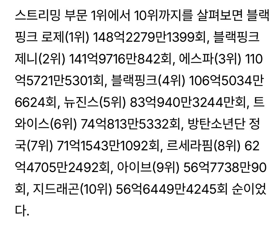 기사보면 제니, 에스파 스트리밍수 각각 141억 9716만, 110억 5721만인데 표엔 앞자리수 빼먹은듯