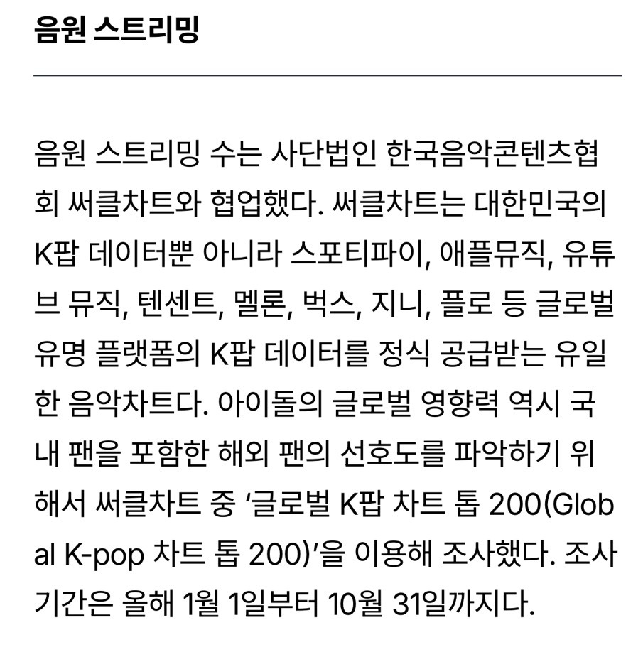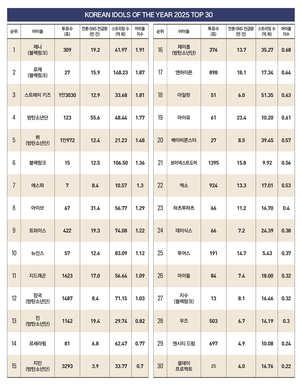 올해 ‘KOREAN IDOLS OF THE YEAR’에서 최고의 아이돌로 선정된 주인공은 블랙핑크 제니였다. 제니가 1위에 오른 이유는 특정 분야에서 성과가 두드러졌기 때문이 아니라, 음원 스트리밍, 언론·SNS 언급량, 팬 투표 등 모든 지표에서 고르게 상위권에 올랐기 때문이다. 이는 패션·글로벌 브랜드 협업·예능과 다양한 프로젝트 등 제니의 다방면 활동이 미디어에서 꾸준히 조명된 결과로 해석된다.