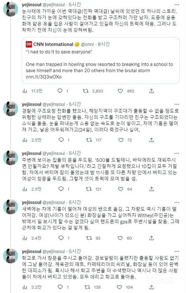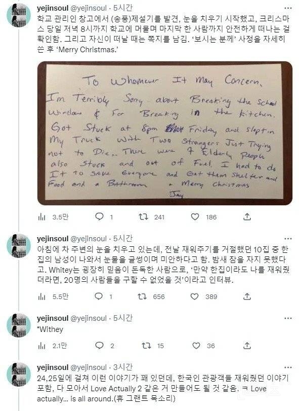 Whitey씨는 폭설에 고립되었다는 친구를 구하러 떠났다가 본인이 고립됨 친구는 구조되었지만 본인을 구하러 올 구조대가 없다는 걸 알게되자 근처 집들을 돌아다니며 하룻밤만 재워달라고 부탁했지만 다 거절당함 GPS검색을 통해 근처에 학교가 있는 걸 알고 학교로 대피함 학교근처에도 고립된 사람들이 많을 것이라는 생각에 근처를 돌아다니며 20여명을 구조해서 학교에 대피함 다음 날 대피했던 사람들이 모두 떠나고 학교에 사정을 설명한 편지를 남긴 뒤 본인도 떠나려고 준비중 전날 재워주기를 거절했던 집주인이 밤사이에 죽었을까봐 너무 걱정했다며 울면서 사과함 그러나 독실한 신자였던 Whitey씨는 '만약 한집이라도 나를 재워줬다면 20여명의 사람들을 구할 수 없었을 것'이라고 인터뷰함 크리스마스의 기적