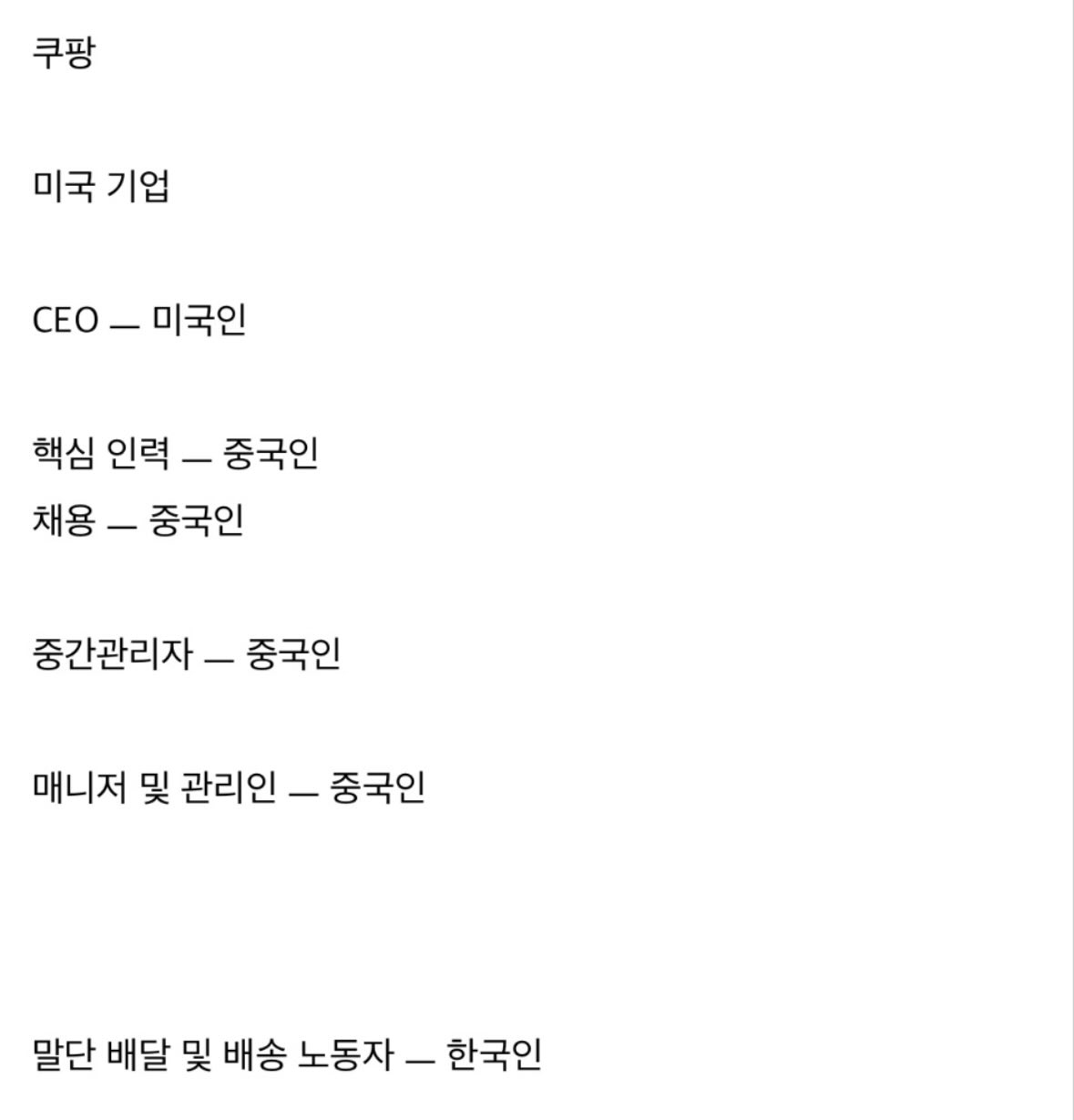 +) 다른 뉴스 찾아보니까 개발인력 중에는 중국인 많은거 맞지만 핵심 인력은 중국인이 아니라 걍 외국인들이래. 그리고 그 외국인들 모시느라 쿠팡에서 돈 엄청나게 쓰고 한국인들은 돈 못 받는게 팩트라네요. 정정합니다.