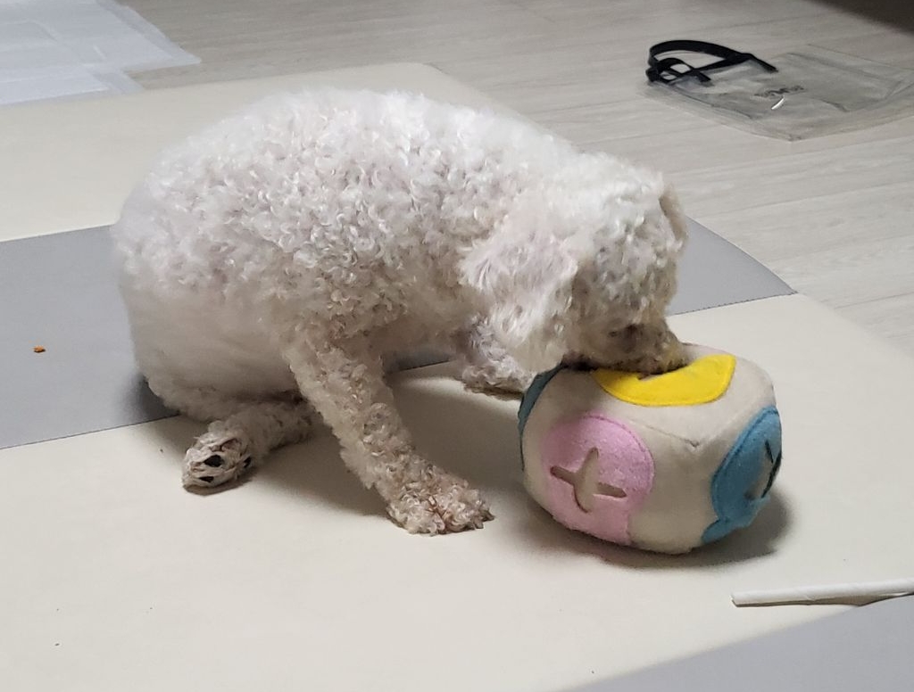 -터그놀이, 공놀이에 흥미없음, 노즈워크는 무척 좋아함...