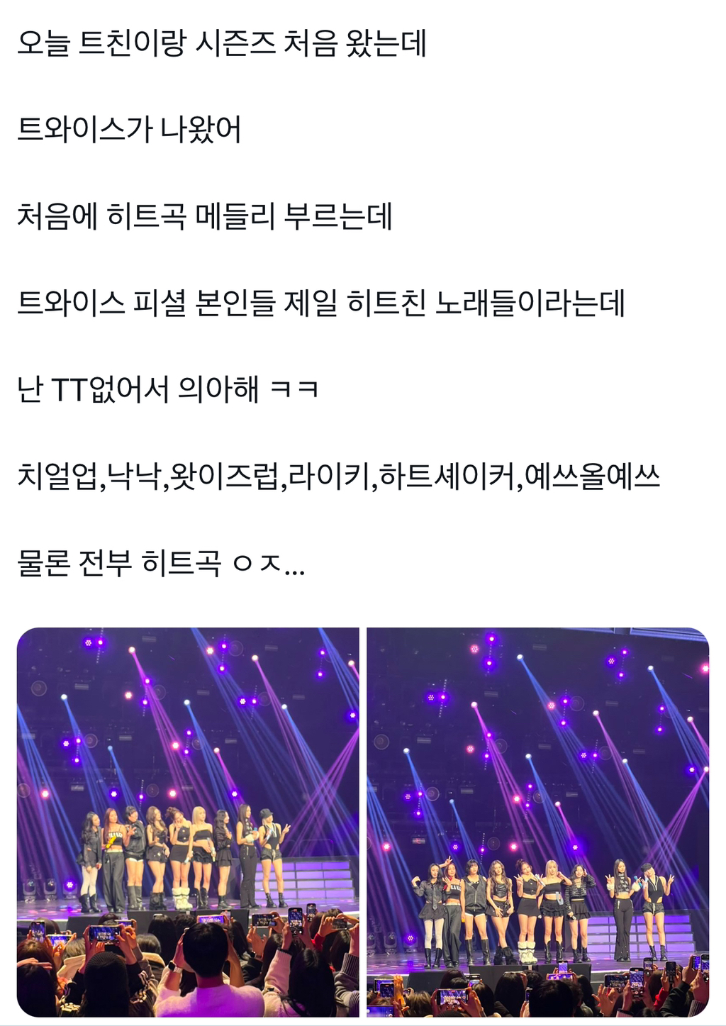 [흥미돋]트와이스가 밝힌 본인들 최고 히트곡 6곡 작성자xhshqm|작성시간25.12.03|조회수35,207 목록 댓글 74 글자크기 작게가 글자크기 크게가 출처: https://www.dmitory.com/issue/390992564 다음검색 현재 게시글 추가 기능 열기 북마크 공유하기 신고 센터로 신고 댓글 댓글 74 댓글쓰기 답글쓰기 댓글 리스트 작성자2025년 로또 1등 당첨자. | 작성시간 25.12.03 난 댄스더나잇어웨이랑 알콜프리 젤 조아해 작성자진규장 | 작성시간 25.12.03 다 인정이지만 빠진 노래가 너무 많잖아여ㅠㅠ 팬시랑 댄나도 없구 작성자내일뭐해뮤지컬봐 | 작성시간 25.12.03 와 본문 받고 댓글까지 싹 다 히트곡… 작성자대자유인 | 작성시간 25.12.03 티티 ㅠㅠ 필스페셜 ㅠㅠ 작성자정신체리자요 | 작성시간 25.12.03 알콜쁘리!! 댓글 전체보기