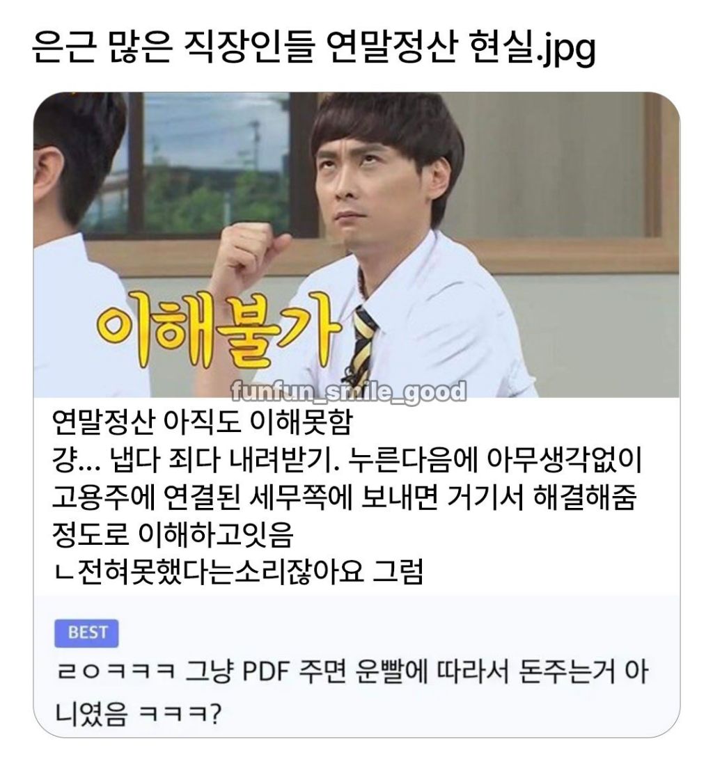 [흥미돋]은근 많은 직장인들 연말정산 현실 작성자뭔쌉소리세요|작성시간25.12.03|조회수23,935 목록 댓글 65 글자크기 작게가 글자크기 크게가 출처: 여성시대 뭔쌉소리세요원출처 도탁스나잖아... 다음검색 현재 게시글 추가 기능 열기 북마크 공유하기 신고 센터로 신고 댓글 댓글 65 댓글쓰기 답글쓰기 댓글 리스트 작성자김치프라이스 | 작성시간 25.12.03 여시들아 도서도 연말정산 따로되지? 작성자하나둘셋얍! | 작성시간 25.12.03 매년할때마다 기상천외한 질문들과 항의로 정병옴(연말정산담당 5년차) 작성자엔씨최정원 | 작성시간 25.12.03 전데요 ㅋ 작성자곽제강 | 작성시간 25.12.04 운빨가챠겜~~ 작성자두두두다다닥 | 작성시간 25.12.04 나도 ㅋㅋㅋㅋ 댓글 전체보기