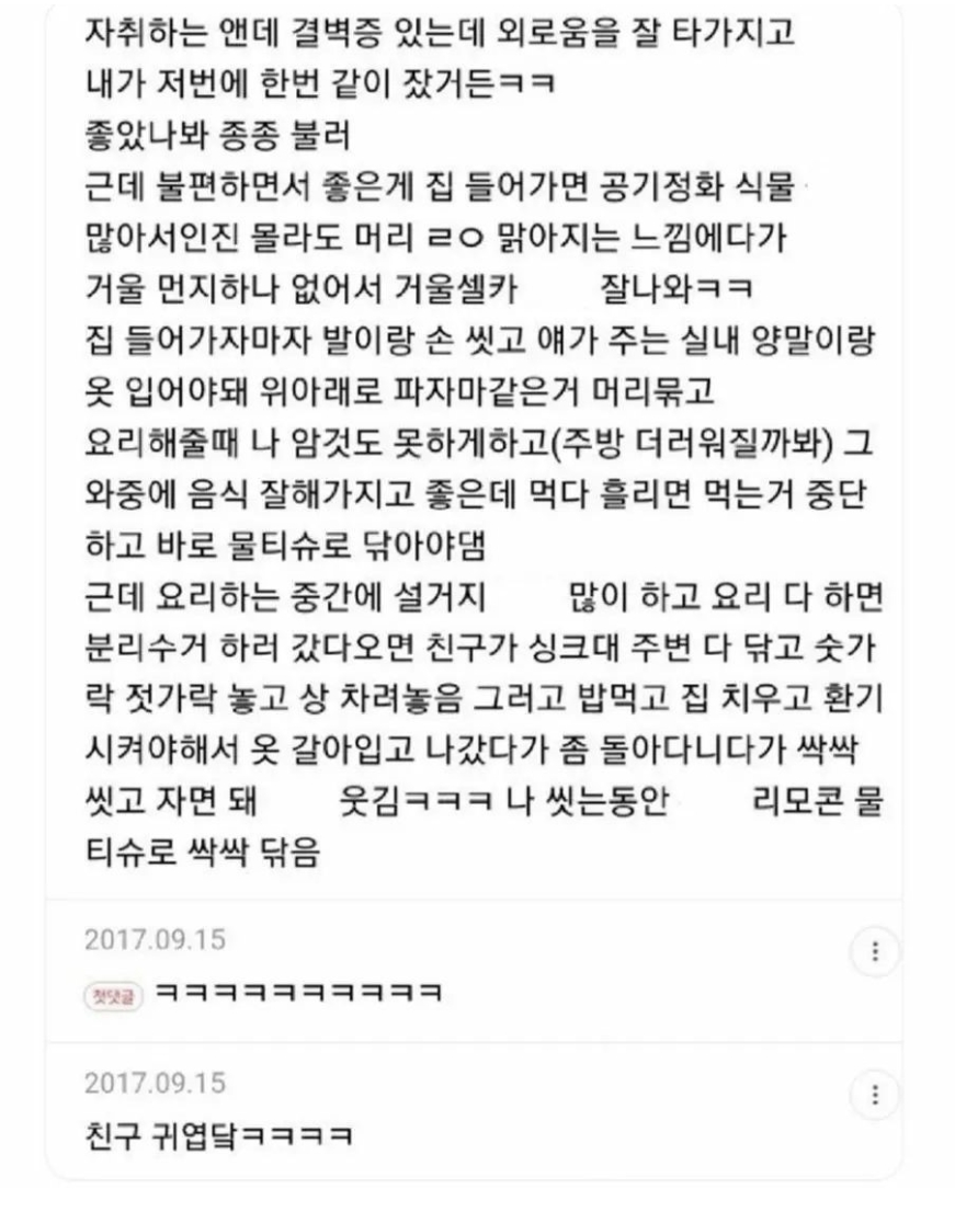 작성자그냥주민1 작성시간 25.12.03 ㅋㅋㅋㅋㅋㅋㅋ저거 글쓴이가 결벽증 친구 방식을 존중하고 잘 따라줘서 그럼