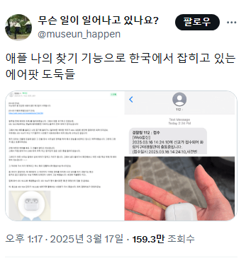 [스크랩] [흥미돋]애플 나의 찾기 기능으로 한국에서 잡히고 있는 에어팟 도둑들 작성자Rooose|작성시간25.12.03|조회수7,854 목록 댓글 4 글자크기 작게가 글자크기 크게가 출처: https://x.com/museun_happen/status/1901488008198803533 인용 다음검색 스크랩 원문 : *여성시대* 차분한 20대들의 알흠다운 공간 현재 게시글 추가 기능 열기 북마크 공유하기 신고 센터로 신고 댓글 댓글 4 댓글쓰기 답글쓰기 댓글 리스트 작성자수마나라라라 | 작성시간 25.12.03 오 대박 이렇게도 잡을 수 있군 삭제된 댓글입니다. 답댓글 작성자Rooose 작성자 본인 여부 작성자 | 작성시간 25.12.03 삼성껀 어떤지 모르겠는데.. 애플은 기기 첫 등록한 사람이 직접 초기화 해야해. 작성자딸기요거트케이크 | 작성시간 25.12.04 내 에어팟 들고 자기집까지 가더라… 댓글 전체보기