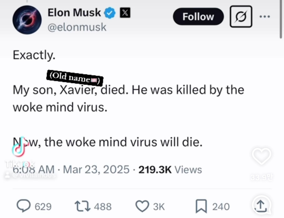 이에 머스크가 "내 아들 제이비어는 죽음" 이라고 반격