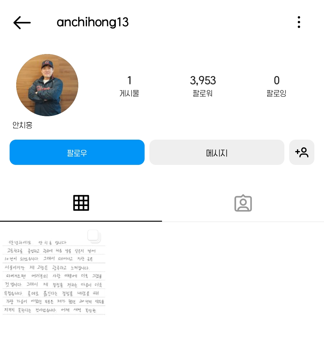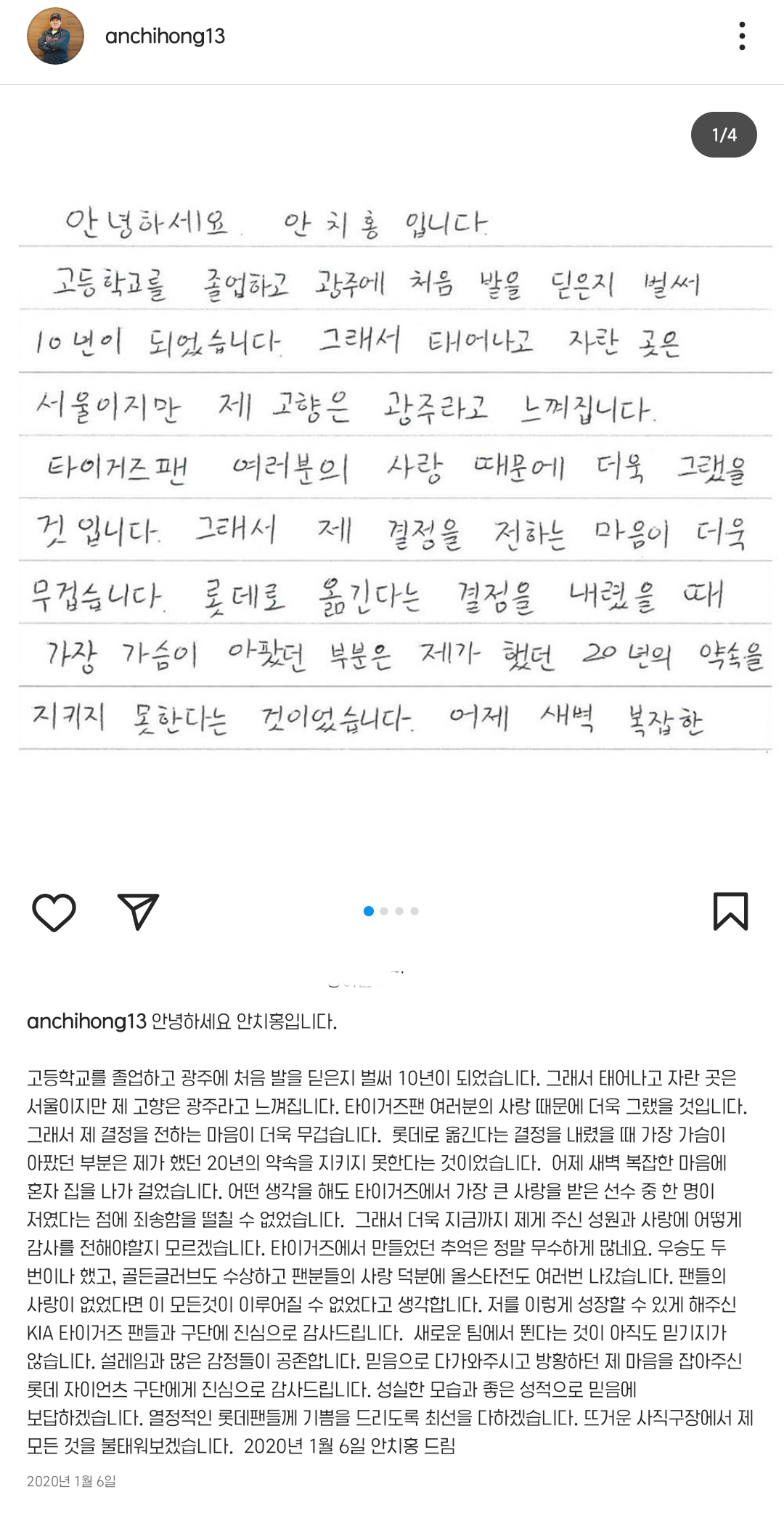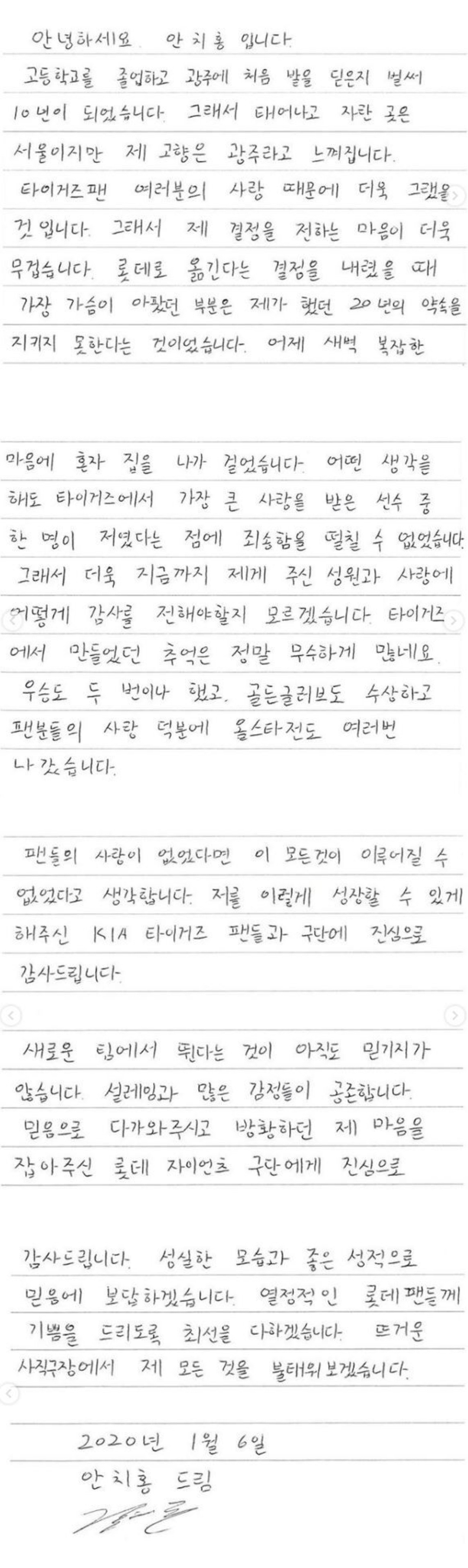 [스크랩] [기타][KBO] FA로 팀을 떠나게 된 선수들이 쓴 편지 중 가장 진정성이 느껴지는 편지 작성자서아유|작성시간25.12.04|조회수14,971 목록 댓글 35 글자크기 작게가 글자크기 크게가 출처 : 여성시대 유소정 여자 친구전 기아 타이거즈 현 롯데 자이언츠 선수 안치홍많은 편지를 봤지만가장 진정성이 담긴 편지였던 것 같음참고로 저 편지 때문에 인스타 개설하고 그 뒤로 인스타 사용하지 않음팬들에게 편지를 남기기 위해 개설한 인스타임반박 시 님 말도 맞고 내 말도 맞아요에이전시가 시켜서 쓴 것이겠지만 그 편지들 중 가장 진정성이 느껴졌음 다음검색 스크랩 원문 : *여성시대* 차분한 20대들의 알흠다운 공간 현재 게시글 추가 기능 열기 북마크 공유하기 신고 센터로 신고 댓글 댓글 35 댓글쓰기 답글쓰기 댓글 리스트 작성자안녕하싀소 | 작성시간 25.12.04 내 첫 유니폼….ㅠㅠㅠ 치홍아 아직도 널 응원한다 작성자선재갖고튀어 | 작성시간 25.12.04 치홍아 다시 돌아와 작성자팡팡콩팡퐁 | 작성시간 25.12.04 키움에서 다시 불타올랐으면 좋겠어 진짜로. 작성자ㅇㅇ깝치지마 | 작성시간 25.12.04 저때 울었다 …. 작성자아기하마 | 작성시간 25.12.06 여전히 응원한다 건야행야해라 그리고 돌아와 댓글 전체보기