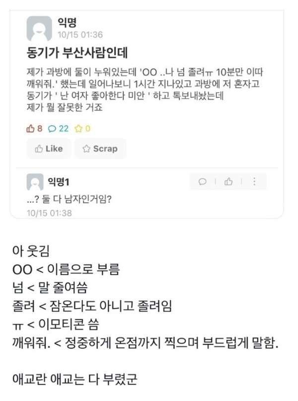 답댓글 작성자자정잉어 작성자 본인 여부 작성자 작성시간 25.12.05 00아 << 이 호칭이 가족사이나 연인사이에서나 쓰는 호칭같은 거라... 동성친구(특히남자끼리)는 잘 안씀. 쌍도남들이 서로 부를때는 무조건 (예시) 성준이!! 성준!! 아니면 성을 같이 붙여서 김성준!! 이런식임. 절대 다정하게 00아 이렇게 부르지않음