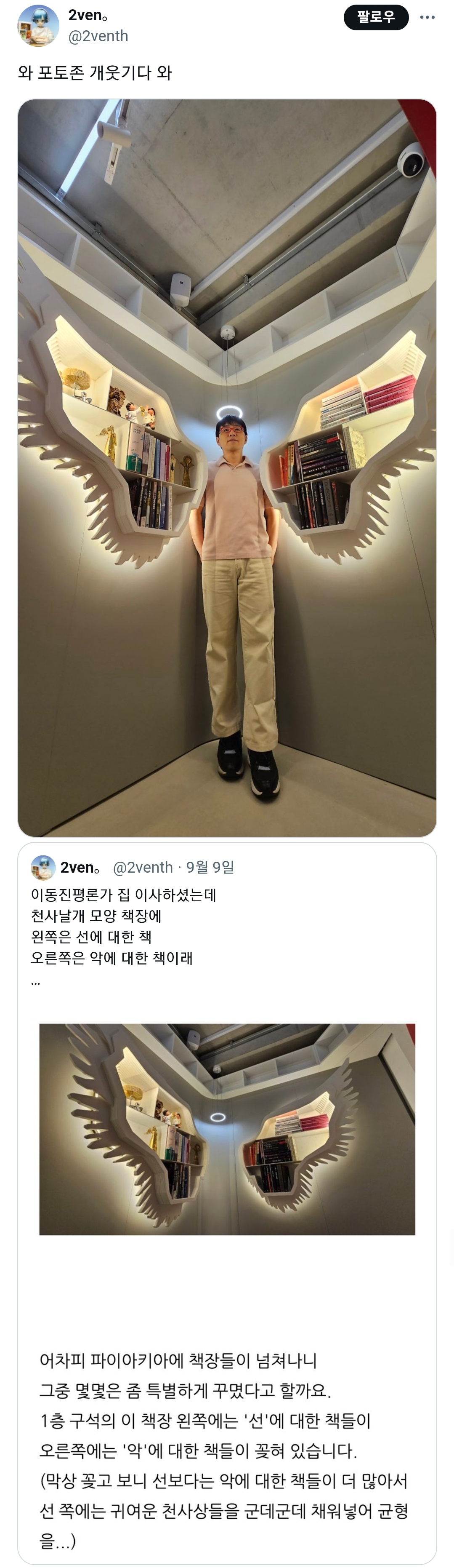 작성자허걱스 작성시간 25.12.04 미감이랑 뭔상관 ㅋㅋㅋㅋ근데 한쪽은 선 반대쪽은 악에 대한 책으로 분류해놓은거 자체가 뭔가 진ㅁ자 본인만의 뭔가가 있는 사람같아서 더 느낌있는데 ㅋㅋㅋ