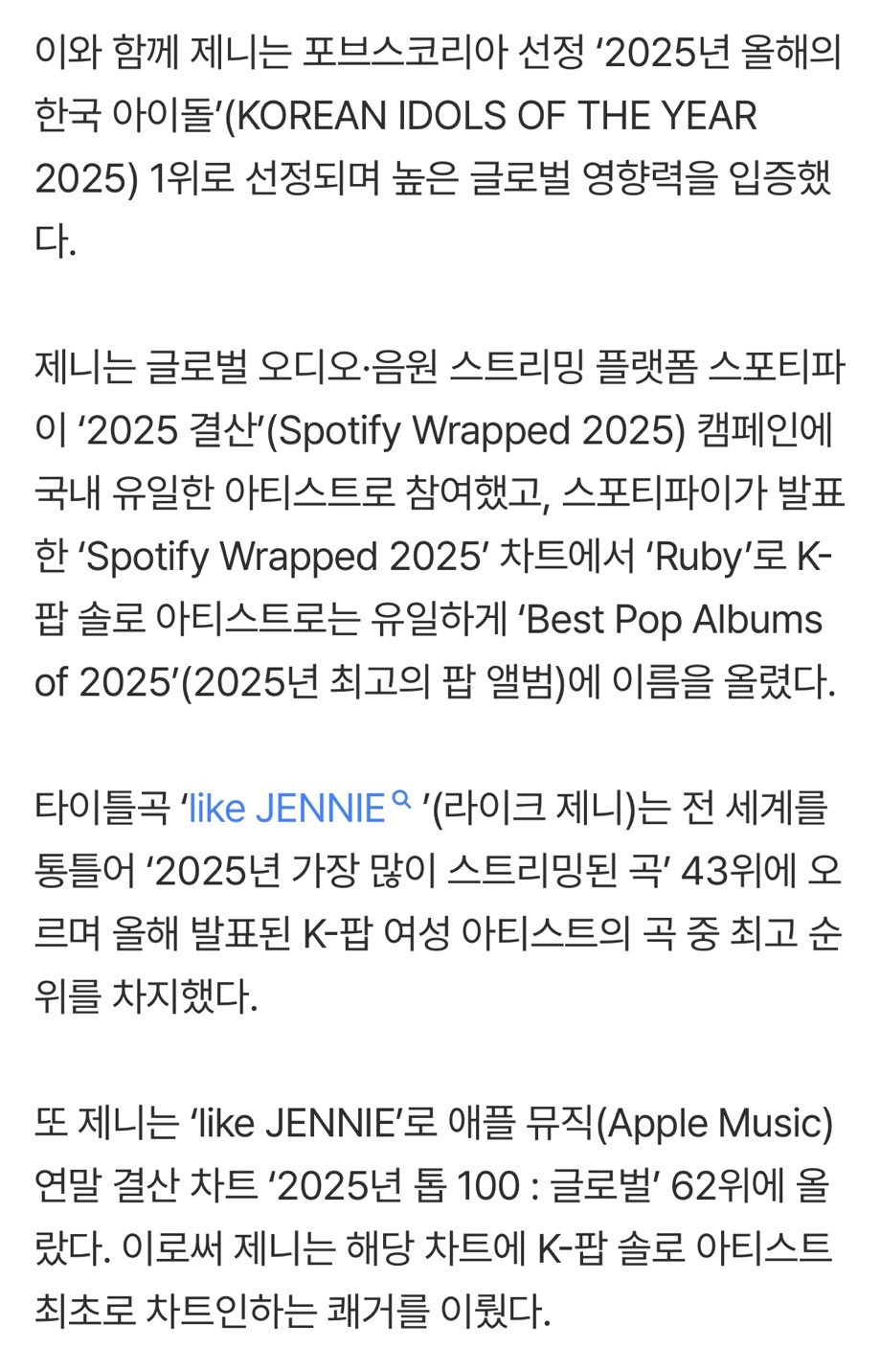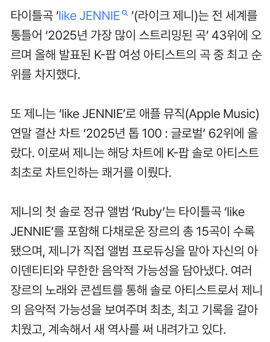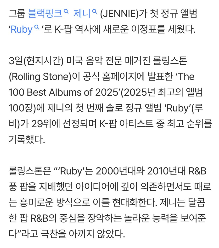 [여시뉴스데스크]블랙핑크 제니 ‘루비’, 미국 롤링스톤 ‘2025년 최고의 앨범’ 선정 작성자Kidcudi|작성시간25.12.04|조회수8,038 목록 댓글 32 글자크기 작게가 글자크기 크게가 출처: https://m.entertain.naver.com/home/article/009/0005600830블랙핑크 제니 ‘루비’, 미국 롤링스톤 ‘2025년 최고의 앨범’ 선정여기를 눌러 링크를 확인하세요m.entertain.naver.com 다음검색 현재 게시글 추가 기능 열기 북마크 공유하기 신고 센터로 신고 댓글 댓글 32 댓글쓰기 답글쓰기 댓글 리스트 작성자홍김동 | 작성시간 25.12.04 마마 생각나ㅋㅋㅋㅋ 작성자따봉고슴도치의 습격 | 작성시간 25.12.04 진짜 거를곡이 없음 ㅠㅠㅠ다 좋아 진심 작성자팔ㅈㅐ | 작성시간 25.12.04 띵반이예여 작성자pinkaboo | 작성시간 25.12.04 ㅇㅈ 명반....아직도 들어 작성자쪼록 | 작성시간 25.12.04 인정 댓글 전체보기