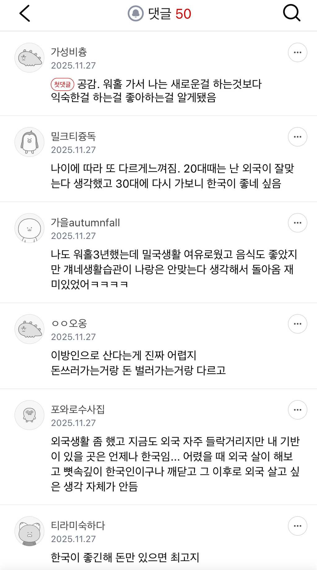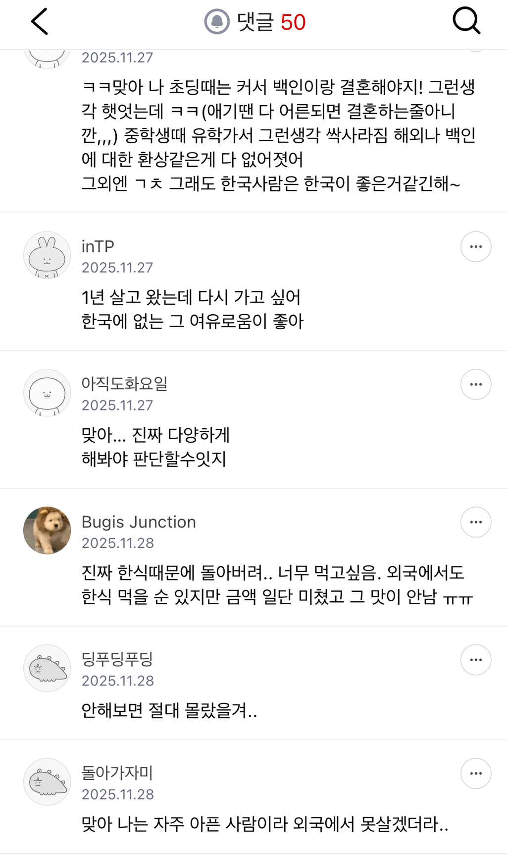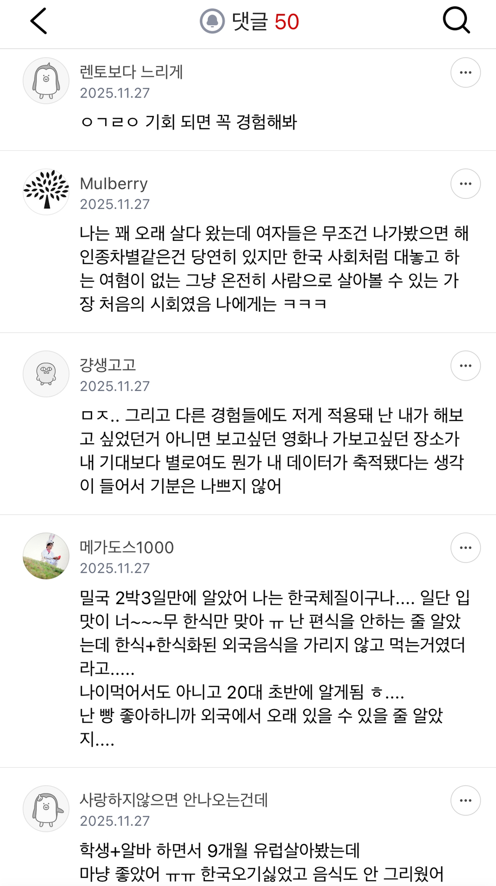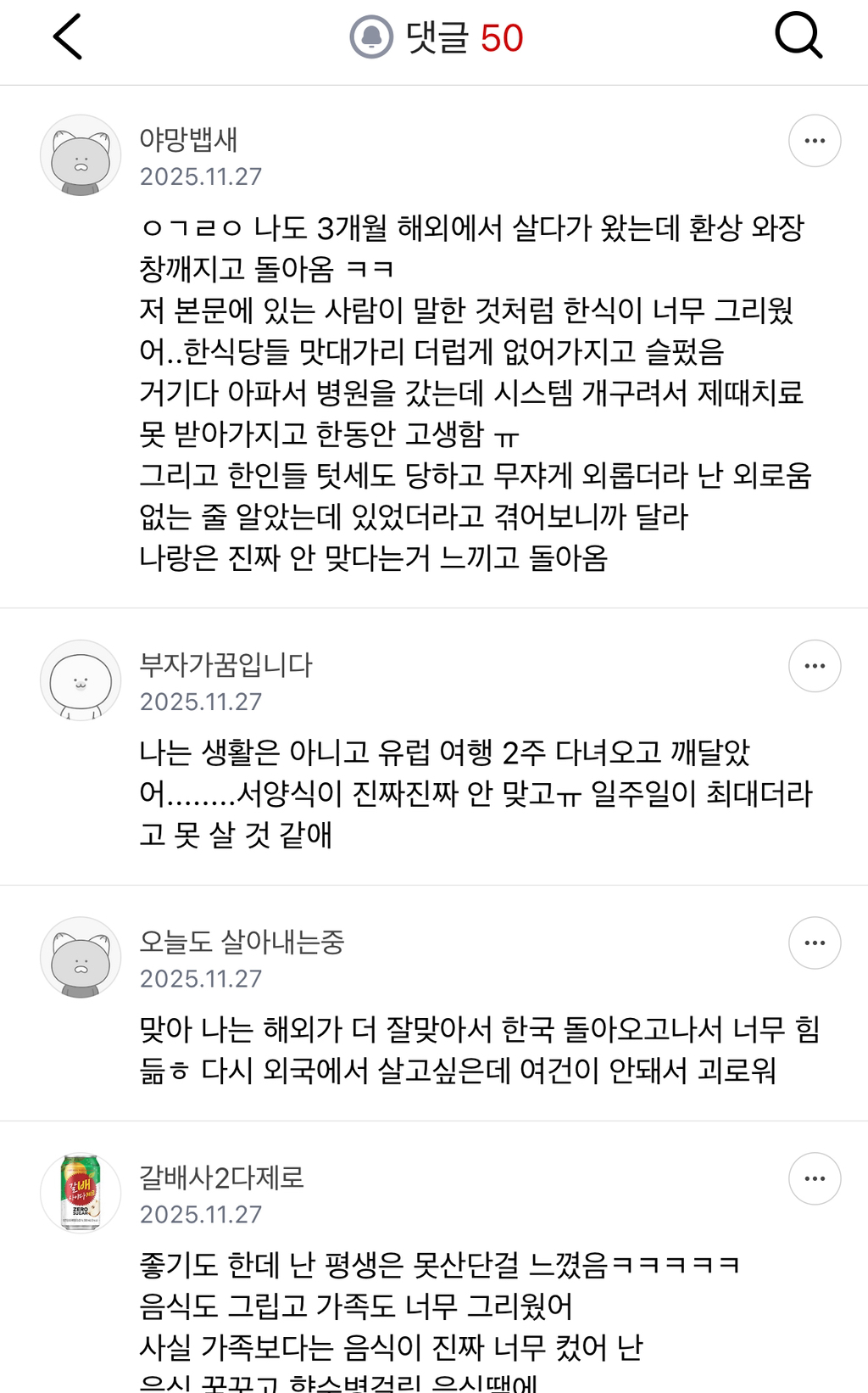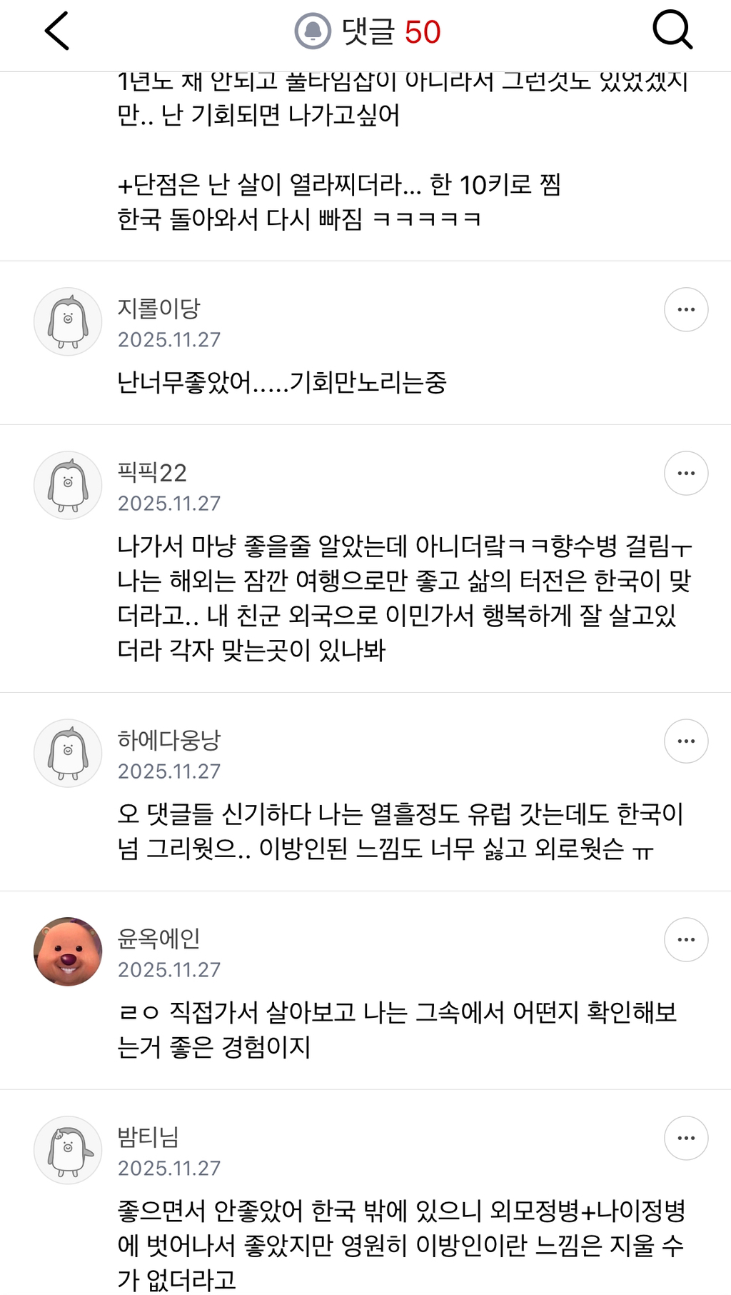 작성자frustration tolerance 언젠간 잘해 작성시간 25.12.05 해외는 ... 진짜 잠깐 살다오는게 베스트임