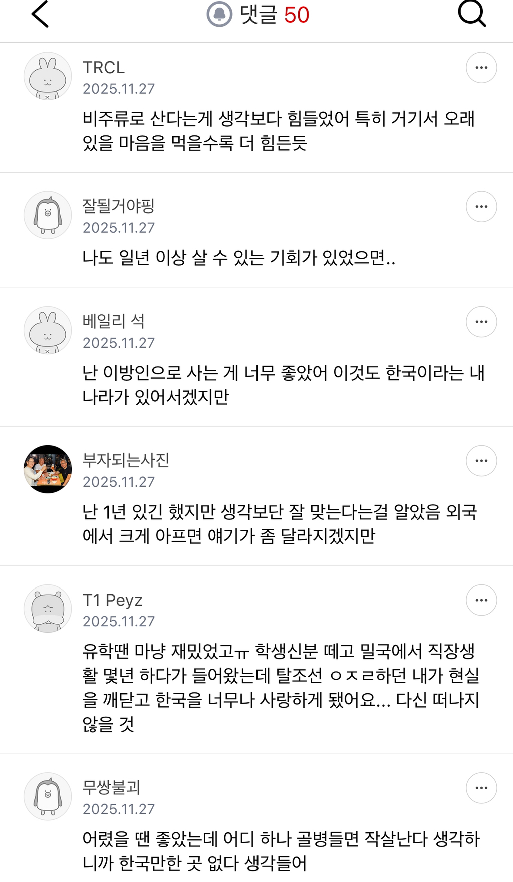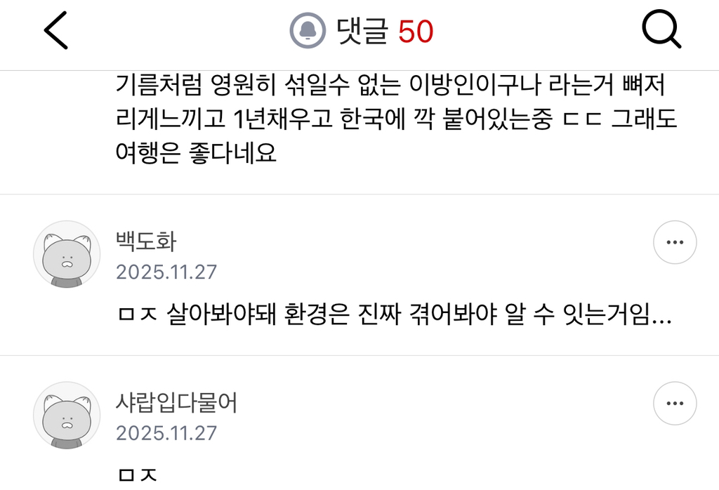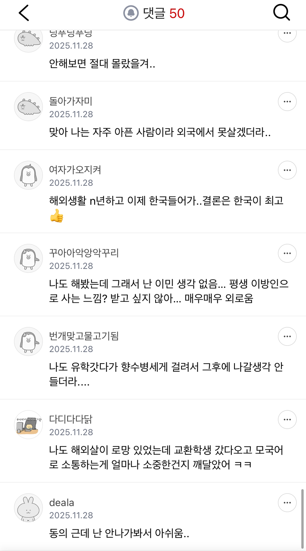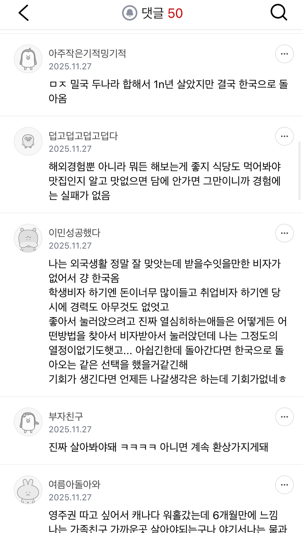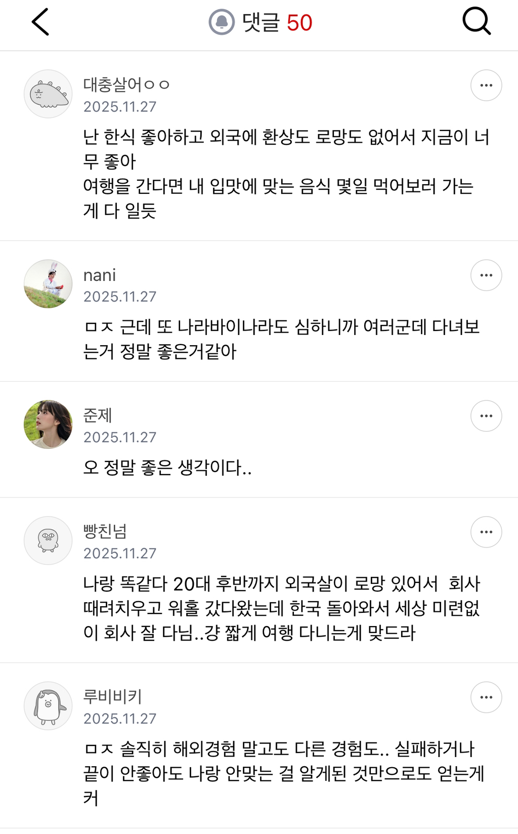 작성자frustration tolerance 언젠간 잘해 작성시간 25.12.05 해외는 ... 진짜 잠깐 살다오는게 베스트임