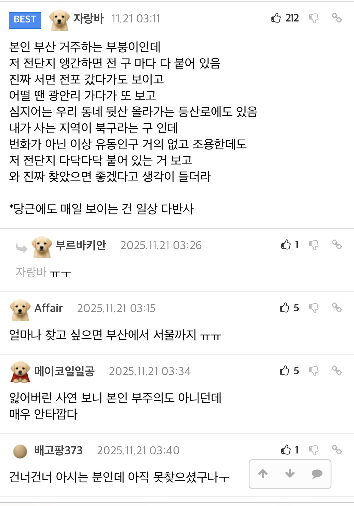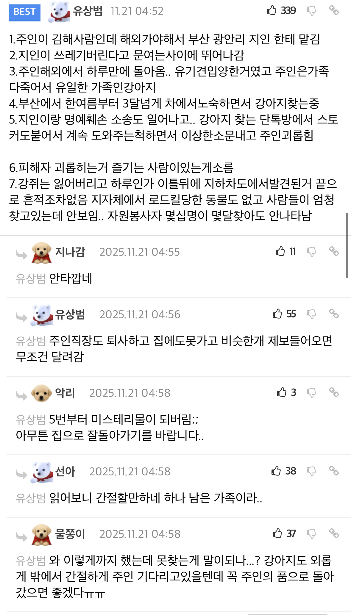 [스크랩] [흥미돋]사례금 500만원 걸린 강아지 작성자설긔|작성시간25.12.04|조회수57,112 목록 댓글 60 글자크기 작게가 글자크기 크게가 출처: 여성시대 폼폼부린직장까지 관두시고 전국에 전단지 붙이셨다함 다음검색 스크랩 원문 : *여성시대* 차분한 20대들의 알흠다운 공간 현재 게시글 추가 기능 열기 북마크 공유하기 신고 센터로 신고 댓글 댓글 60 댓글쓰기 답글쓰기 댓글 리스트 작성자슬의생활 | 작성시간 25.12.04 아가야 돌아와ㅜㅜ 작성자@Rihanna | 작성시간 25.12.04 내장칩 있으니 누구한테 발견만 되라 제발.. ㅜㅜㅜ 집에가자 아가 작성자땃쥐G | 작성시간 25.12.04 호랑아 집가자 ㅠㅠ 작성자딥치즈 베이컨 포테이토 | 작성시간 25.12.04 아..진짜 너무 안타깝다ㅠㅠ 꼭 찾았으면 좋겠어 작성자부앙단 망곰이 | 작성시간 25.12.04 이제 날 너무 추운데 얼른 집에가라ㅜㅜ 댓글 전체보기