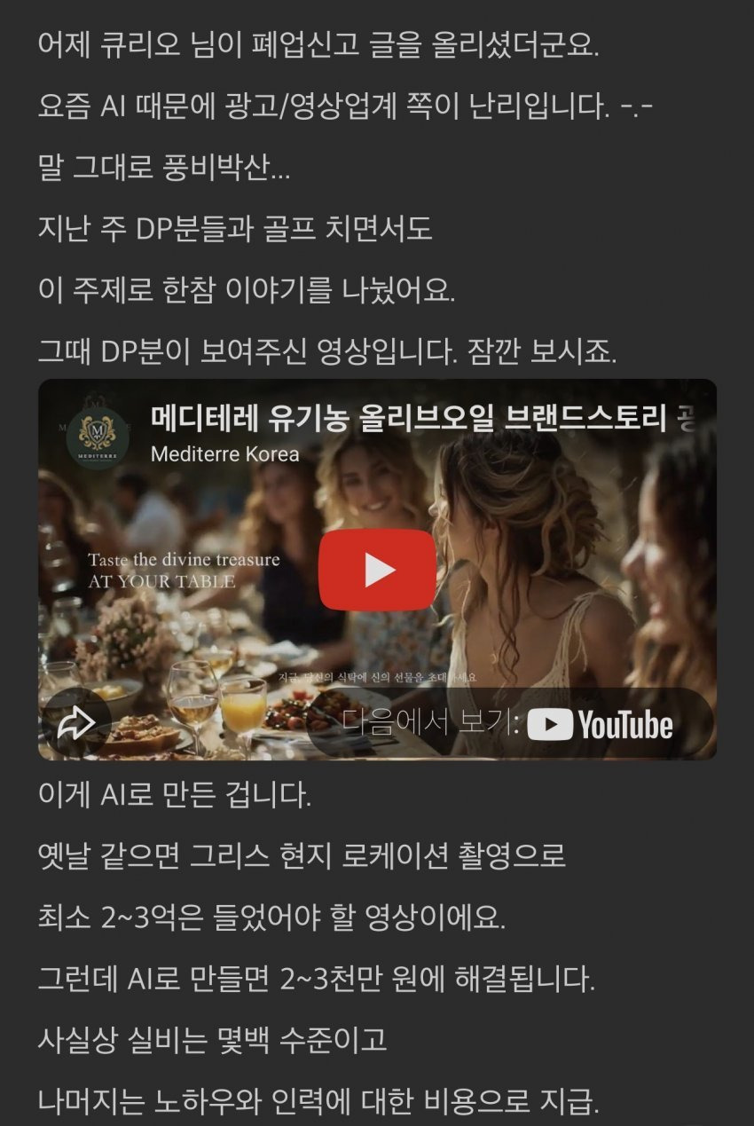 작성자시공의균열 작성시간 25.12.04 이런거보면 사무직은 걍 1순위로 대체될듯..연예인 쓰고 안 쓰고의 문제가 아님ㅋㅋㅋ연예인 모델만 일하나....관련 매니저 제작사들 소품 미술 조명 감독 카감 싹다 밥줄 끊기는건데..