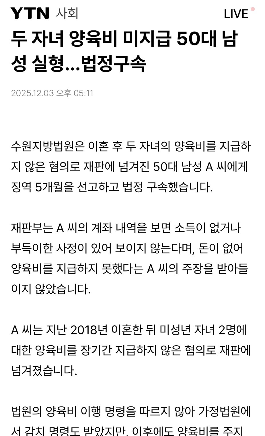[여시뉴스데스크]두 자녀 양육비 미지급 50대 남성 실형...법정구속 작성자인덕션역|작성시간25.12.04|조회수5,314 목록 댓글 18 글자크기 작게가 글자크기 크게가 출처: https://m.ytn.co.kr/news_view.amp.php?version=1¶m=0103_202512031711415955두 자녀 양육비 미지급 50대 남성 실형...법정구속수원지방법원은 이혼 후 두 자녀의 양육비를 지급하지 않은 혐의로 재판에 넘겨진 50...m.ytn.co.kr요약: 낳았으면 책임져라.. 전문 출처로 다음검색 현재 게시글 추가 기능 열기 북마크 공유하기 신고 센터로 신고 댓글 댓글 18 댓글쓰기 답글쓰기 댓글 리스트 작성자토매이도 | 작성시간 25.12.04 들어가서 고생도 해야되는데 요샌 깜빵이 호텔 아님? 작성자emlemle | 작성시간 25.12.04 굿 작성자엘크루 | 작성시간 25.12.04 우와 굿 작성자옴뇨뇸 | 작성시간 25.12.04 오 드디어 구속되냐고 작성자호랑이귀여워 | 작성시간 25.12.04 굿 댓글 전체보기