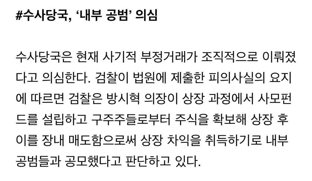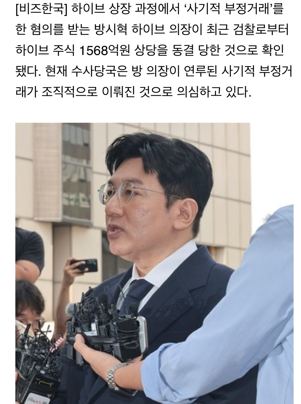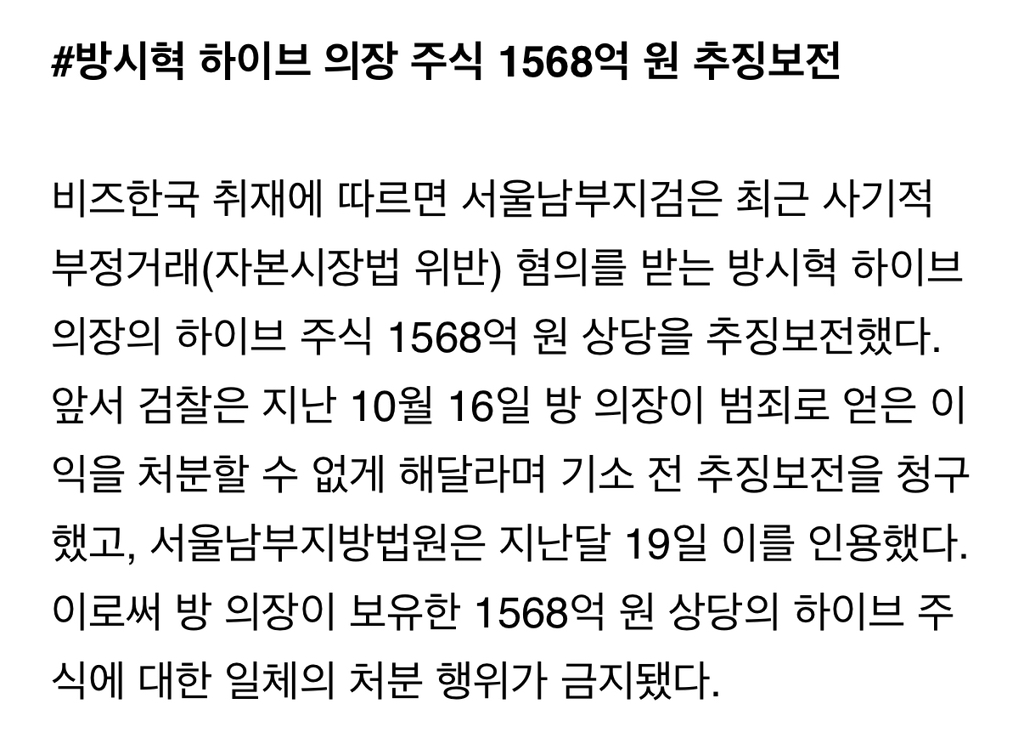 [여시뉴스데스크][단독] 방시혁 의장, 하이브 주식 1568억 '추징보전' 동결됐다 작성자굿굿바이|작성시간25.12.04|조회수4,663 목록 댓글 81 글자크기 작게가 글자크기 크게가 출처: https://www.bizhankook.com/bk/article/30871(중략)(중략)전문 출처로 다음검색 현재 게시글 추가 기능 열기 북마크 공유하기 신고 센터로 신고 댓글 댓글 81 댓글쓰기 답글쓰기 댓글 리스트 작성자올조이 | 작성시간 25.12.06 아니 쟤 사모펀드로 저것보다 더 이득챙겼는데... 저것만?? 답댓글 작성자볼리밥 | 작성시간 25.12.09 ㄹㅇ 쟤 재산 훨많지않아? 작성자카밀소프트핸드크림 | 작성시간 25.12.06 아니 왜이렇게 조용함? ㅇㅌ ㅁㅎㅈ 글은 천플 넘어가고 그러더니; 답댓글 작성자볼리밥 | 작성시간 25.12.09 ㅁㅎㅈ은 아는데 ㅇㅌ은 누구야? 작성자볼리밥 | 작성시간 25.12.09 범죄자 댓글 전체보기