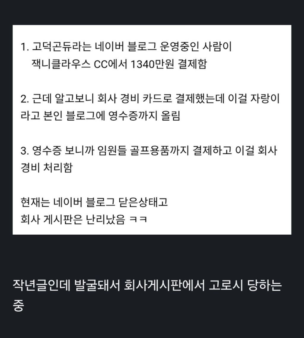 [기타]현재 난리난 삼성전자 임원들 회삿돈으로 골프용품 구매 작성자쪼이잉죠잉|작성시간25.12.04|조회수35,383 목록 댓글 158 글자크기 작게가 글자크기 크게가 출처: https://m.ruliweb.com/community/board/300143/read/73287994 다음검색 현재 게시글 추가 기능 열기 북마크 공유하기 신고 센터로 신고 댓글 댓글 158 댓글쓰기 답글쓰기 댓글 리스트 작성자애기뚱땡이 | 작성시간 25.12.05 곤듀 열사님... 작성자화이랭 해야 | 작성시간 25.12.05 아 곤듀가 임원이 아니었어? 임원이라 자랑한줄 작성자몹된장모치와와 | 작성시간 25.12.05 내부고발인듯.... 작성자빨간 겨울 | 작성시간 25.12.05 곤듀 자랑질 하고 싶었던 거 같음.. 저런 글 엄청 많고 재밌어함 작성자가오니너무귀여워 | 작성시간 25.12.05 걍 자랑하려고 올린것 같은데 ㅋㅋㅋㅋㅋ 댓글 전체보기