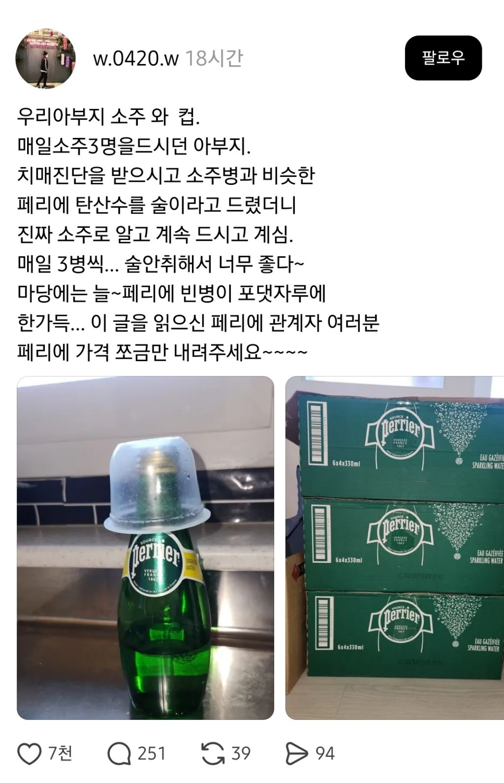 [흥미돋]매일 소주 3병 드시던 아버지 속이는법 작성자윈스턴|작성시간25.12.05|조회수48,328 목록 댓글 33 글자크기 작게가 글자크기 크게가 출처: https://www.threads.com/@w.0420.w/post/DR1EMbokgqW?xmt=AQF0HH4ecfUSlMlEoZGtEBXgKVlNBXslq_lXkRO2CA2Vh69wu88P1l1EM0W5xaTGrKCbLsIw&slof=1Threads의 @w.0420.w님우리아부지 소주 와 컵. 매일소주3명을드시던 아부지. 치매진단을 받으시고 소주병과 비슷한 페리에 탄산수를 술이라고 드렸더니 진짜 소주로 알고 계속 드시고 계심. 매일 3병씩... 술안취해서 www.threads.com천잰데? 다음검색 현재 게시글 추가 기능 열기 북마크 공유하기 신고 센터로 신고 댓글 댓글 33 댓글쓰기 답글쓰기 댓글 리스트 작성자더스트 | 작성시간 25.12.05 ㅠㅠ 작성자모두들부자되자(the rich) | 작성시간 25.12.05 와 자식의 마음이다 ㅜ 작성자가감감 | 작성시간 25.12.05 ㅠㅠㅠㅠㅠㅠㅠ 작성자돈점그만써라 | 작성시간 25.12.05 시골 어르신중에... 일이 고되 몸아파서 드시다가 의존증으로 넘어가는 경우 꽤 많더라 ㅜ ... 작성자배뽈록퉁퉁퉁사후르 | 작성시간 25.12.05 하........꿀팁이네 댓글 전체보기