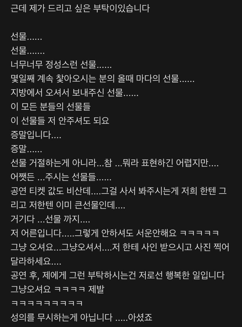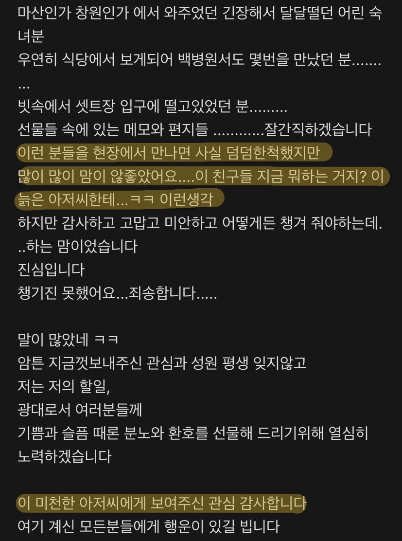 [흥미돋]이성민배우가 촬영장에 팬들이 와서 선물 주니까 팬카페 와서 쓰고 갔던 글.twt 작성자안물어봤따요다야|작성시간25.12.05|조회수23,394 목록 댓글 53 글자크기 작게가 글자크기 크게가 출처: 여성시대 (안물어봤따요다야)쿠션어ㅋㅋㅋㅋㅋ엄청나게 깔았음그리고 팬미팅도 팬들이 설명해주니까 "나를 만나는데 니네들이 돈을 낸다고?" 이럼ㅋㅋㅋㅋㅋㅋ 다음검색 현재 게시글 추가 기능 열기 북마크 공유하기 신고 센터로 신고 댓글 댓글 53 댓글쓰기 답글쓰기 댓글 리스트 작성자컨텍스트 | 작성시간 25.12.05 이게 정상이지... 작성자아프지말고 짜샤 | 작성시간 25.12.05 김혜수 배우님도 이런 반응이셨잖아 작성자인태희 | 작성시간 25.12.06 진짜 이게 맞지..당연하다는 듯 받지 말고 사람들이 좀 염치들 있어라. 작성자오랜지맛쿠키 | 작성시간 25.12.06 정상 작성자이모지지지 | 작성시간 25.12.08 진짜 으른 댓글 전체보기