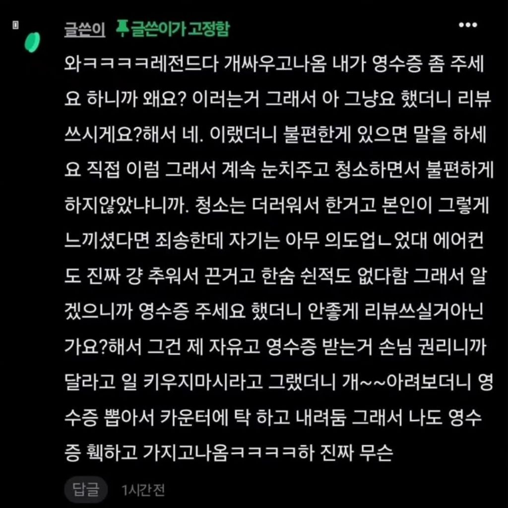 작성자고슴도치애.슯격 작성시간 25.12.06 영수증 달라고 했을때 저런 반응 보인 것 부터 자기 태도가 별로였다는 걸 본인도 인정하는 거잖아ㅋㅋㅋㅋ