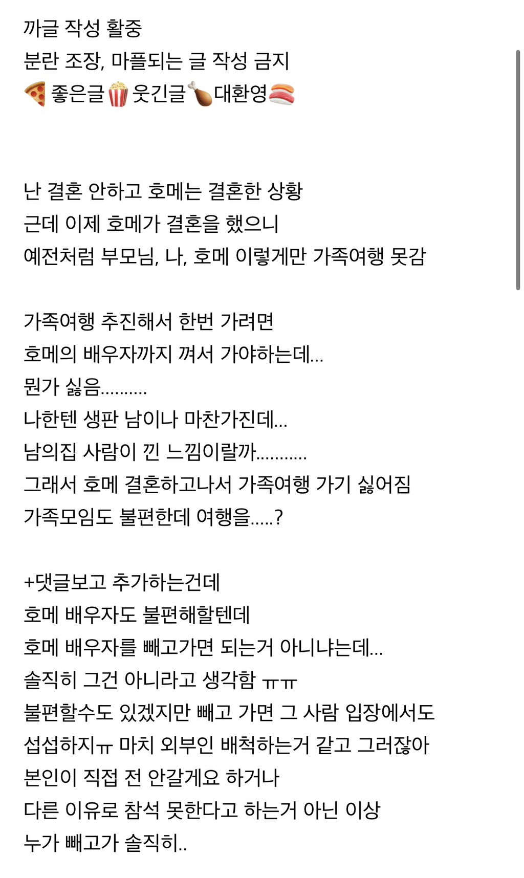 작성자피털팬 작성시간 25.12.09 나 진짜 이해가 안되네. 좋든 싫든 내 가족이 선택한 사람인데 벽칠 생각부터 하는거야? 난 새언니가 우리 오빠랑 결혼해줘서 너무 고맙고 나랑 나이차이도 얼마 안 나니까 친구 생긴거 같아서 더 좋던데. 뭐.. 오빠나 남동생 입장에선 새로운 주가정이 생긴거니 호메인 쓰니가 빠져주면 되긴 하겠다.
