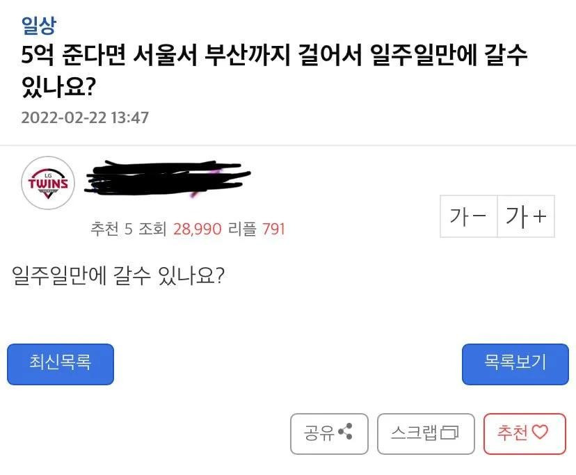 [스크랩] [흥미돋]5억준다면 서울에서 부산 걸어서 일주일만에 갈수있나요? 작성자flflf|작성시간25.12.06|조회수13,504 목록 댓글 55 글자크기 작게가 글자크기 크게가 다음검색 스크랩 원문 : 도탁스 (DOTAX) 현재 게시글 추가 기능 열기 북마크 공유하기 신고 센터로 신고 댓글 댓글 55 댓글쓰기 답글쓰기 댓글 리스트 작성자머니머니해도뭐니 | 작성시간 25.12.06 나신발신었네 형 작성자HAILMARY | 작성시간 25.12.06 일주일???한달조요 작성자굽시늬우스의 띠 | 작성시간 25.12.06 일주일????? 씁....... 시간을 좀 더 주시오.. 작성자인류의보석 | 작성시간 25.12.06 뛸게 작성자복세편살할거구요? | 작성시간 25.12.07 삽가능 12시간정도씩 걸어가면 됨. 댓글 전체보기