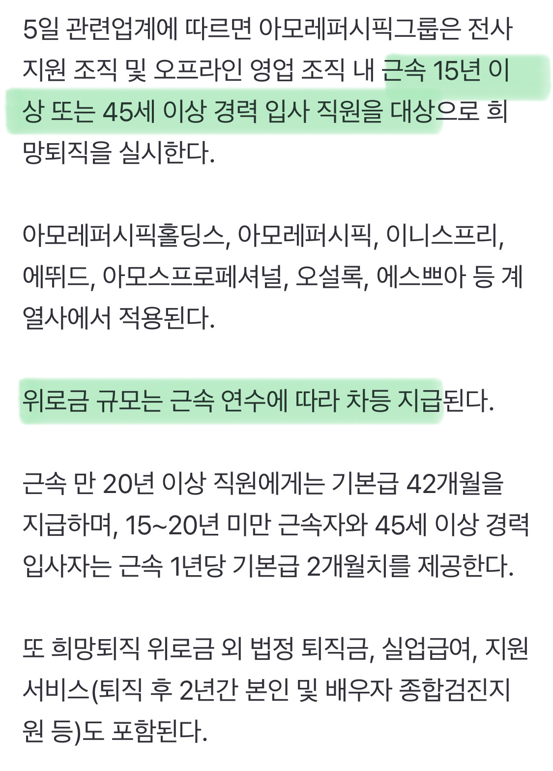 [기타]아모레퍼시픽, 희망퇴직 단행 작성자(본인닉네임).|작성시간25.12.06|조회수31,724 목록 댓글 28 글자크기 작게가 글자크기 크게가 출처: https://n.news.naver.com/article/003/0013641036?sid=101 다음검색 현재 게시글 추가 기능 열기 북마크 공유하기 신고 센터로 신고 댓글 댓글 28 댓글쓰기 답글쓰기 댓글 리스트 작성자운동화찾아주는여시 | 작성시간 25.12.06 돈많이 받아가는 사람 짜르고 신입 쓰는거지뭐... 작성자입입입! | 작성시간 25.12.06 허얼… 작성자noooproblem | 작성시간 25.12.06 45세 이상 경력직에 이커머스 전환하려고 자른다는데 뭐 그럴만하다고 생각함 작성자대통령은이재명 | 작성시간 25.12.06 백화점 매니저들 … 나가야지 작성자모자단추 | 작성시간 25.12.06 그래서 제가 서탈했나요,,,~~~ 댓글 전체보기