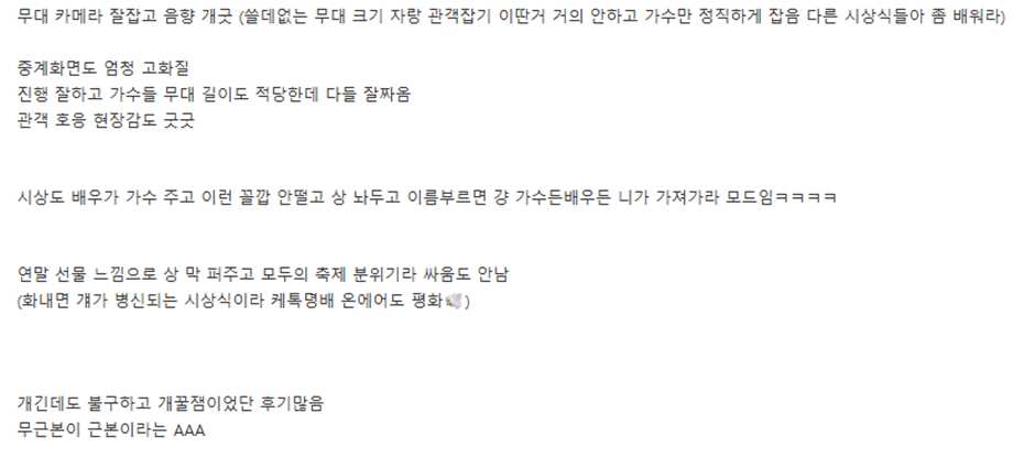 작성자오레옹 작성시간 25.12.06 베스트웰컴상 이승기 군대 제대했다고 줌ㅋㅋㅋ 본인도 굉장히 머쓱해 했던것 같은데ㅋㅋ