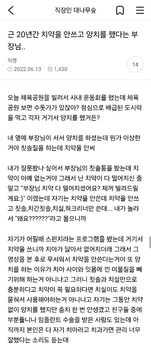 작성자협승이 작성시간 25.12.06 치약 안가지고 가서 아침에 칫솔질만 한 적 있는데 치아 사이사이의 아똥내에 질식할 뻔.. 대단하다 저렇게 관리하면 아침에 아똥내도 안나나?
