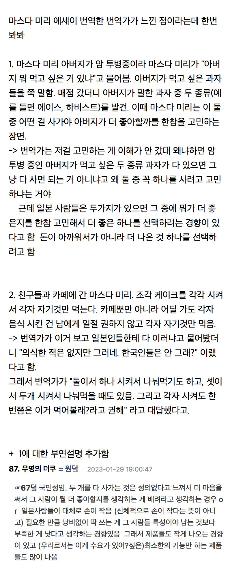 [스크랩] [기타]일어 번역가가 느낀 한국/일본 국민성 차이.jpg 작성자본인 닉네임.|작성시간25.12.06|조회수10,238 목록 댓글 17 글자크기 작게가 글자크기 크게가 출처: 여성시대 뿜뿜뿌리https://theqoo.net/square/2705919344 다음검색 스크랩 원문 : *여성시대* 차분한 20대들의 알흠다운 공간 현재 게시글 추가 기능 열기 북마크 공유하기 신고 센터로 신고 댓글 댓글 17 댓글쓰기 답글쓰기 댓글 리스트 작성자벌써2년 | 작성시간 25.12.06 아빠가 과자를 딱 한 개만 먹고 싶었으면 한개만 말했겠지 정말 이해안가네 작성자샴푸냥 | 작성시간 25.12.07 쫌스럽다 작성자HOLBORN | 작성시간 25.12.07 거지근성 작성자만자오 | 작성시간 25.12.07 짜친다 저것만 봐도 곁에 두기 싫어 음침하잖아 작성자나데지마 | 작성시간 25.12.07 아니 다 사가고 만약에 남으면 옆 병실에 주든가 내가 먹든가 하면 되잖아 댓글 전체보기