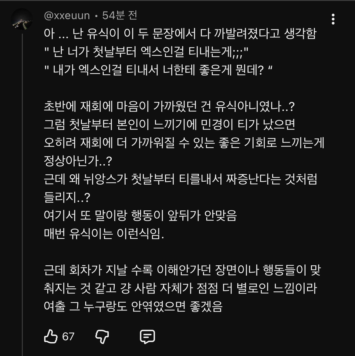 작성자빛나는 별 작성시간 25.12.07 진짜 여기서 쟤만 빼고 다른 전커플들은 서로 대화 잘하고 잡도리도하고 그러는데 쟤만 저지랄떨어서 볼깨마다 빡침