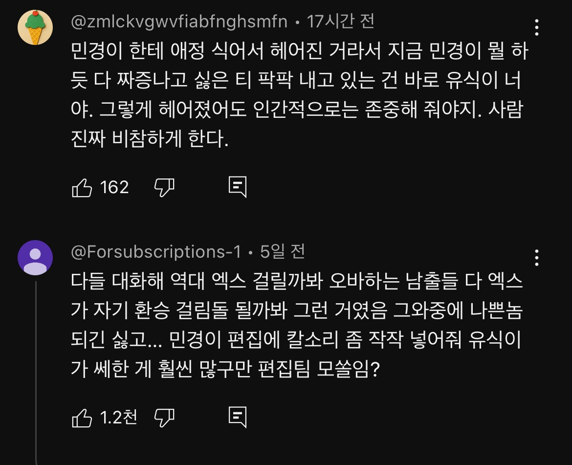 조유식 진심 태도 너무 심각해서 보면서 당황함 민경이가 기대는 것도 무너진다 ㅆㅂ 이러면서 못 앉게 하고 안쪽으로 들어오라고 다그치고 민경이는 침착하게 말하려는데 왜 티내냐고 ㅈㄴ 지랄하는게 이게 맞아?
