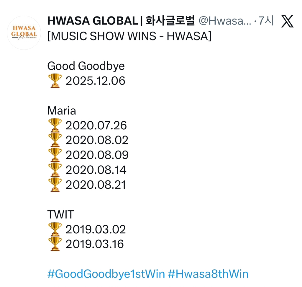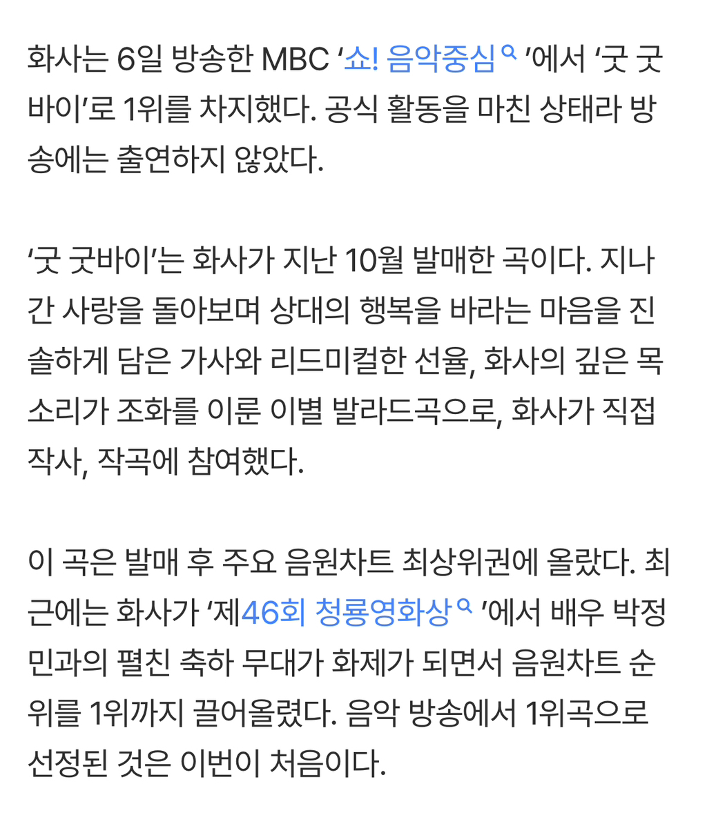 [여시뉴스데스크]화사, '굿 굿바이'로 음방 트로피까지…'쇼! 음악중심' 1위 등극 작성자daybyday|작성시간25.12.06|조회수3,921 목록 댓글 10 글자크기 작게가 글자크기 크게가 출처: https://naver.me/GA8o0xCQ화사, '굿 굿바이'로 음방 트로피까지…'쇼! 음악중심' 1위 등극여기를 눌러 링크를 확인하세요m.entertain.naver.comhttps://x.com/hwasaglobal/status/1997207297446367463?s=46 다음검색 현재 게시글 추가 기능 열기 북마크 공유하기 신고 센터로 신고 댓글 댓글 10 댓글쓰기 답글쓰기 댓글 리스트 작성자어른 마스크 | 작성시간 25.12.06 노래 진짜 너무 좋아😭😭😭😭 작성자싱하목장 | 작성시간 25.12.06 노래 개조아 진심 작성자천둥번개반짝 | 작성시간 25.12.06 노래 너무좋아 화사 작성자가니디 | 작성시간 25.12.07 화사 진짜 예전에도 커리어하이다 싶었는데 거기서 더 올라갈곳이 있었다니 작성자고래를 타고 떠나는 여행 | 작성시간 25.12.07 노래 진짜 좋아!! 댓글 전체보기