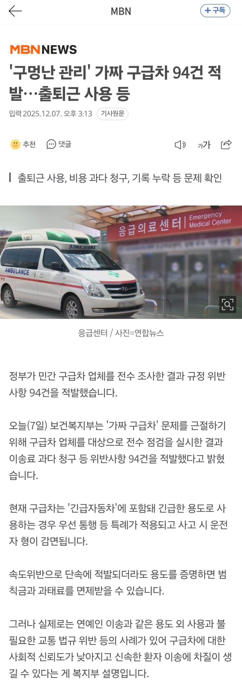 [여시뉴스데스크]'구멍난 관리' 가짜 구급차 94건 적발…출퇴근 사용 등 작성자알티드래곤|작성시간25.12.07|조회수3,230 목록 댓글 1 글자크기 작게가 글자크기 크게가 출처: https://naver.me/x1mY1pIH'구멍난 관리' 가짜 구급차 94건 적발…출퇴근 사용 등정부가 민간 구급차 업체를 전수 조사한 결과 규정 위반사항 94건을 적발했습니다. 오늘(7일) 보건복지부는 '가짜 구급차' 문제를 근절하기 위해 구급차 업체를 대상으로 전수 점검을 실시한 결n.news.naver.com 다음검색 현재 게시글 추가 기능 열기 북마크 공유하기 신고 센터로 신고 댓글 댓글 1 댓글쓰기 답글쓰기 댓글 리스트 작성자세노세요? | 작성시간 25.12.07 1년에 94건인건가 1달에 94건인건가가 안나오네 댓글 전체보기