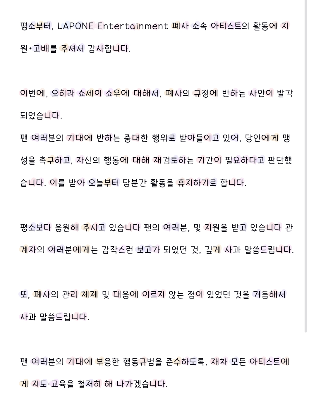 양측 소속사는 오히라와 이이다 둘다 활동중단을 하겠단