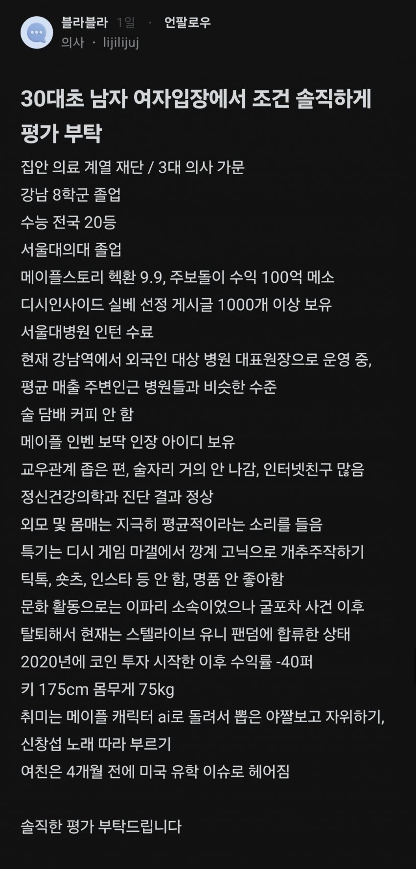 [흥미돋]30대 초 남자 솔직한 평가 부탁 작성자폼봄부린|작성시간25.12.07|조회수19,530 목록 댓글 71 글자크기 작게가 글자크기 크게가 출처: 여성시대 폼폼부린 다음검색 현재 게시글 추가 기능 열기 북마크 공유하기 신고 센터로 신고 댓글 댓글 71 댓글쓰기 답글쓰기 댓글 리스트 작성자거짓말은하지마요 | 작성시간 25.12.08 메이플이나 해라 시발 작성자대강살자고 | 작성시간 25.12.08 저렇게 아무렇지 않게 혐오스러운 모습까지 말할 수 있다는게 남성스럽다 작성자햄주먹밥 | 작성시간 25.12.08 메이플만 안했어도; 작성자선플달기위원회 | 작성시간 25.12.08 쓰레기같아요 ㅠ 작성자호롤로맛 | 작성시간 25.12.09 무슨 답을 원하는 건지? 댓글 전체보기