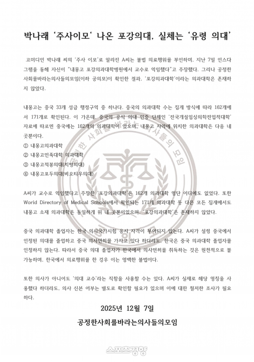 공의모는 “이씨가 교수로 역임했다고 주장한 ‘포강의과대학’은 162개 중국 의과대학 명단 어디에도 없었다”며 “중국 의대 졸업자가 한국에서 의사면허를 취득하는 것은 원천적으로 불가능하고, 한국에서 의료행위를 한 경우 이는 명백한 불법”이라고 했다.