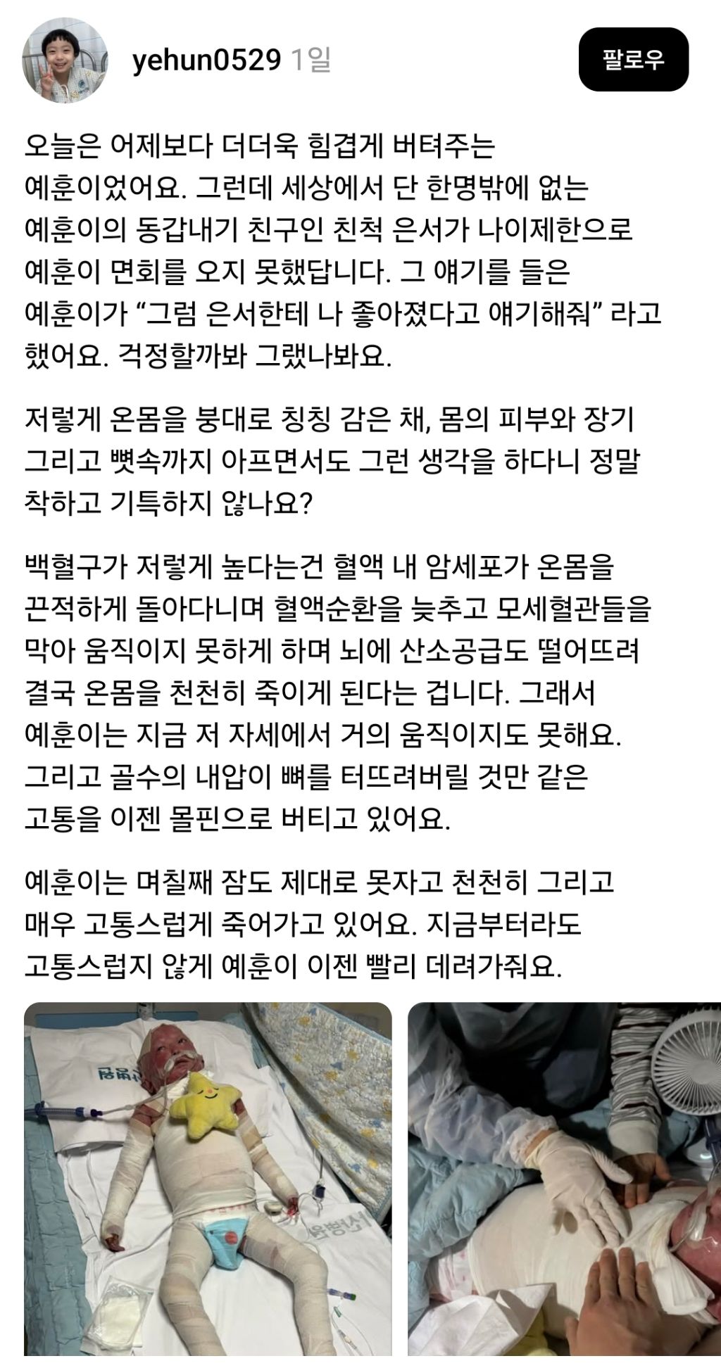생후 8개월부터 백혈병 투병한 예훈이의 투병기를 전하던 아버지 계정에 오늘 인스타 스토리로 올라옴