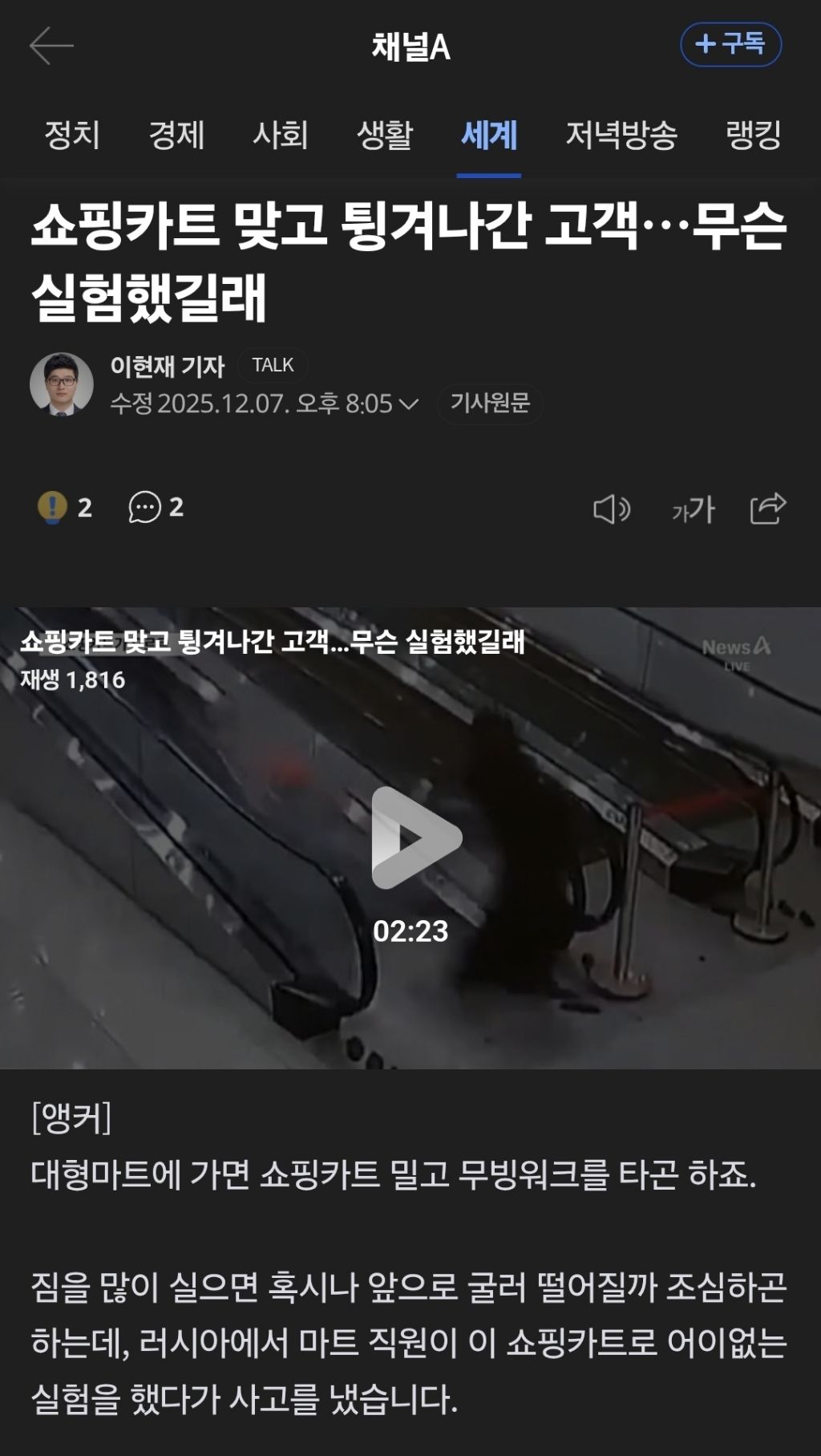 [여시뉴스데스크]쇼핑카트 맞고 튕겨나간 고객…무슨 실험했길래 작성자비혼주의다|작성시간25.12.08|조회수8,619 목록 댓글 3 글자크기 작게가 글자크기 크게가 출처: https://naver.me/FUQxUhk0쇼핑카트 맞고 튕겨나간 고객…무슨 실험했길래대형마트에 가면 쇼핑카트 밀고 무빙워크를 타곤 하죠. 짐을 많이 실으면 혹시나 앞으로 굴러 떨어질까 조심하곤 하는데, 러시아에서 마트 직원이 이 쇼핑카트로 어이없는 실험을 했다가 사고n.news.naver.com여성분 크게 다쳤으면 어쩔 뻔,, 다음검색 현재 게시글 추가 기능 열기 북마크 공유하기 신고 센터로 신고 댓글 댓글 3 댓글쓰기 답글쓰기 댓글 리스트 작성자망고후르투 | 작성시간 25.12.08 실험?... 미친 범죄임 작성자팔만대장내시경 | 작성시간 25.12.08 벽 잡고 걸어가는거 보면 엄청 아파 보이던디 작성자노네임우먼 | 작성시간 25.12.08 아니 최소한 사람 없을때 하던가 미쳤나봐 댓글 전체보기