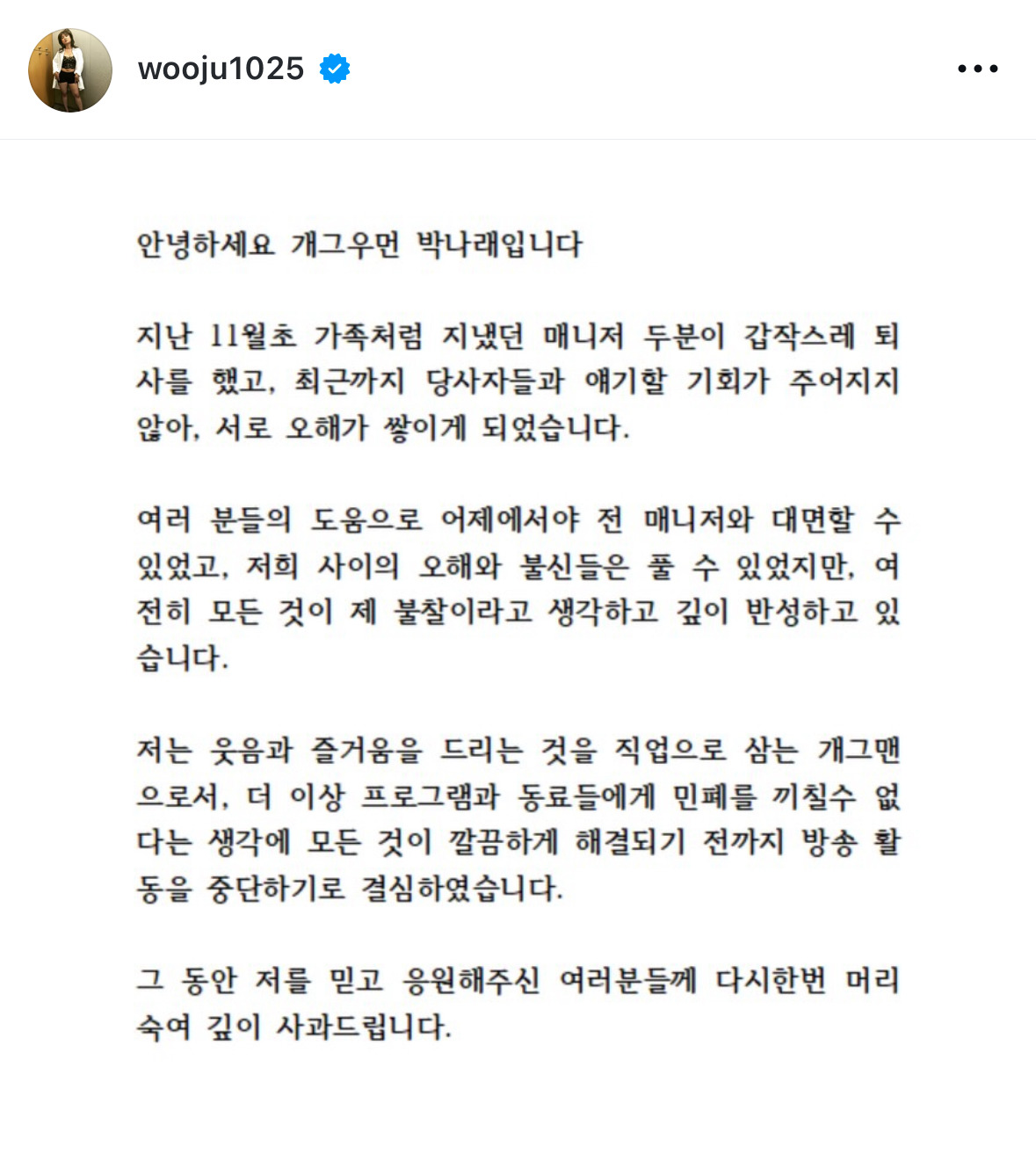 [흥미돋]박나래 인스타 입장문 작성자파하김치|작성시간25.12.08|조회수112,277 목록 댓글 370 글자크기 작게가 글자크기 크게가 출처: 여성시대 파하김치https://www.instagram.com/p/DR_Dfick8gL 다음검색 현재 게시글 추가 기능 열기 북마크 공유하기 신고 센터로 신고 댓글 댓글 370 댓글쓰기 답글쓰기 댓글 리스트 작성자역겨비 | 작성시간 25.12.16 댓글 갈리는 거 신기하다 작성자똑시가되자 | 작성시간 25.12.18 착취한범죄자를 ㅋㅋ옹호하네 작성자승승장구대성할여시 | 작성시간 25.12.19 반성하고 술도 끊고 사람 잘 챙기게되면 돌아와요 작성자카우룽카우링가바 | 작성시간 25.12.19 절대 안 보고싶내요.. 작성자나는롤플래옵치다이아데바데빨랭 | 작성시간 25.12.22 나오지 마세요 댓글 전체보기