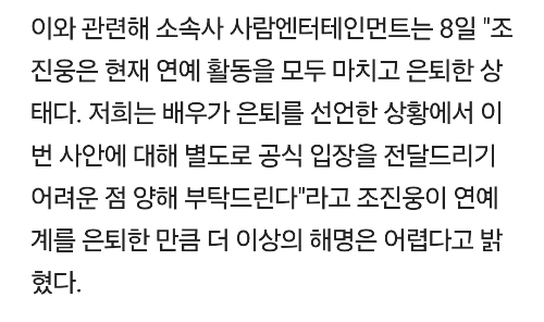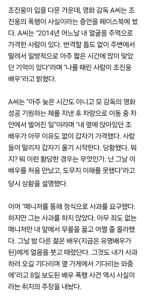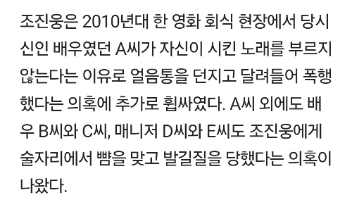[여시뉴스데스크]조진웅, 스타 된 신인 배우도 폭행? "은퇴한 상황, 더 이상의 입장 어렵다" 작성자이제추버요|작성시간25.12.08|조회수37,771 목록 댓글 212 글자크기 작게가 글자크기 크게가 출처: 여성시대 (이제추버요)https://m.news.nate.com/view/20251208n21380 다음검색 현재 게시글 추가 기능 열기 북마크 공유하기 신고 센터로 신고 댓글 댓글 212 댓글쓰기 답글쓰기 댓글 리스트 작성자아 정말 곰도로스 인물이네요^^ | 작성시간 25.12.09 좆됨 진웅이 빤쓰런함 작성자토순토토_모모코코요니 | 작성시간 25.12.09 은퇴라 쓰고 퇴출이라 읽네요.. 작성자멍왕성 | 작성시간 25.12.09 은퇴 핑계대네 작성자옷을너무좋아함 | 작성시간 25.12.09 일생을 범죄자로 살았구나 작성자둘리두 | 작성시간 25.12.10 피해자한테 사과는 안하나.. 댓글 전체보기