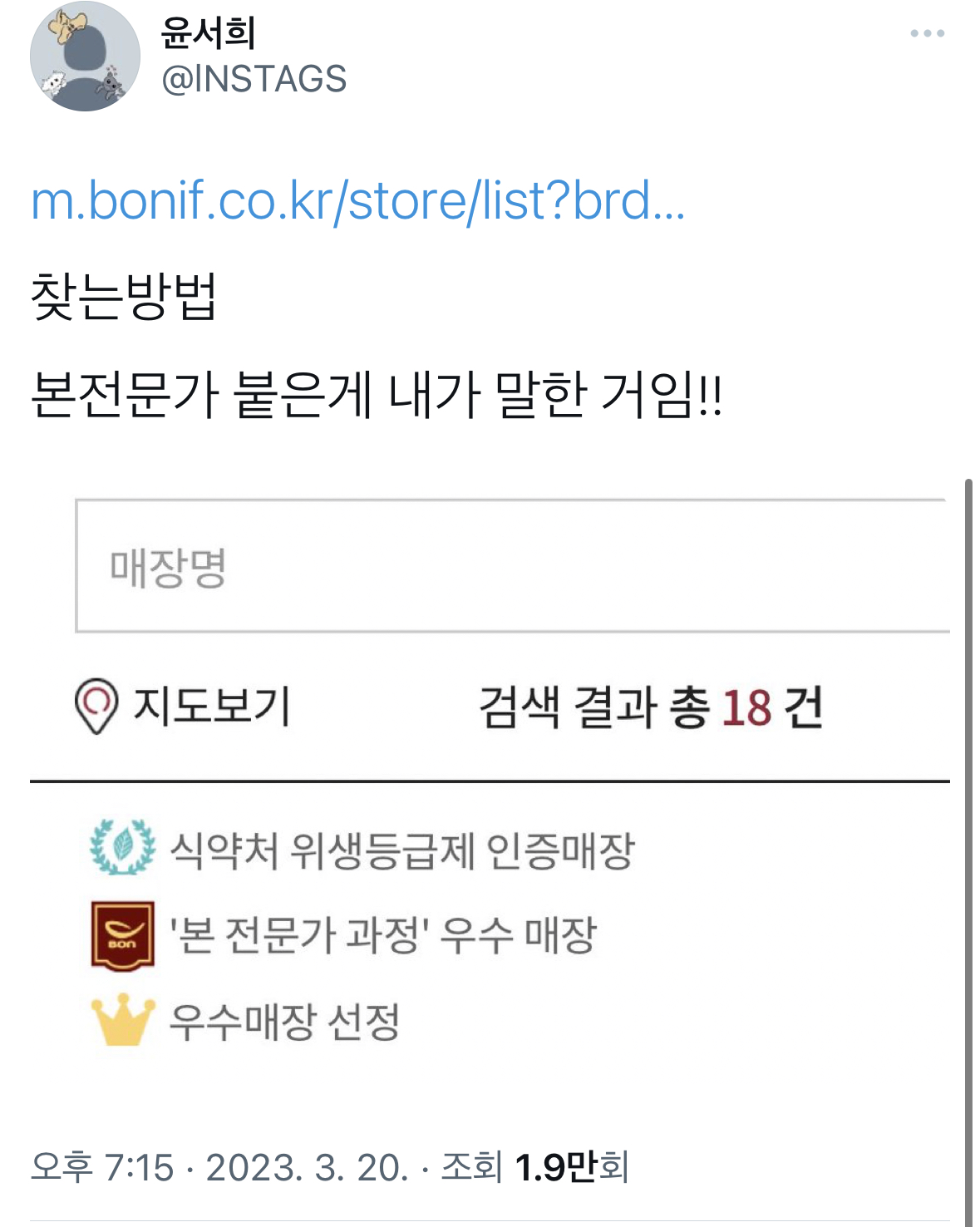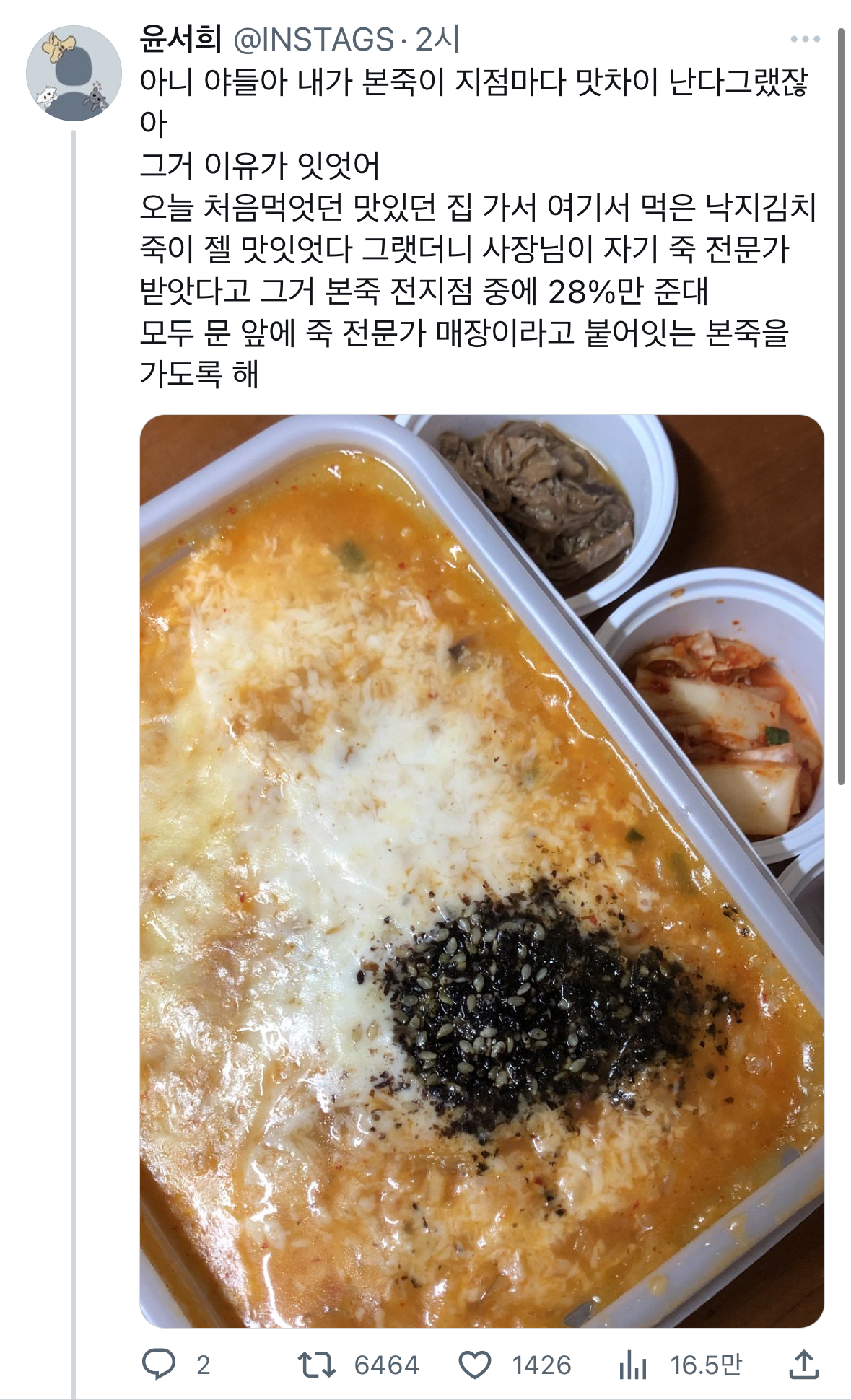 [스크랩] [흥미돋]본죽 지점마다 맛 차이가 있는 이유 작성자돌연사 박물관|작성시간25.12.08|조회수12,499 목록 댓글 11 글자크기 작게가 글자크기 크게가 출처 : 여성시대 gooooooo본죽본죽, 본죽&비빔밥, 본도시락, 본설렁탕 본우리반상. 그리고 우리 음식을 만나는 스마트한 경험, 본오더www.bonif.co.kr출처 트위터에서 즐기는 윤서희“아니 야들아 내가 본죽이 지점마다 맛차이 난다그랬잖아 그거 이유가 잇엇어 오늘 처음먹엇던 맛있던 집 가서 여기서 먹은 낙지김치죽이 젤 맛잇엇다 그랫더니 사장님이 자기 죽 전문가 받앗twitter.com 다음검색 스크랩 원문 : *여성시대* 차분한 20대들의 알흠다운 공간 현재 게시글 추가 기능 열기 북마크 공유하기 신고 센터로 신고 댓글 댓글 11 댓글쓰기 답글쓰기 댓글 리스트 작성자딸기가조앗 | 작성시간 25.12.08 오....어쩐지 맛도리더라 작성자대화산파 | 작성시간 25.12.08 헐 바로 집근처에 있네 담에 한 번 시켜먹어봐야지 작성자오쪼쪼조 | 작성시간 25.12.08 옆동네에 있네 🥲 작성자먀옹먀오옹 | 작성시간 25.12.08 우왁!!!! 우리집앞에 전문가지점이라니!!!! 갑자기 먹고싶어졋어 조만간 먹어야지 작성자예쁜이 | 작성시간 25.12.09 옼ㅋㅋㅋ최근에 엄마한테 죽 사드렸다가, 죽 유독 맛있다며 폭풍 칭찬받았는데 거기도 본전문가 지점이네 댓글 전체보기