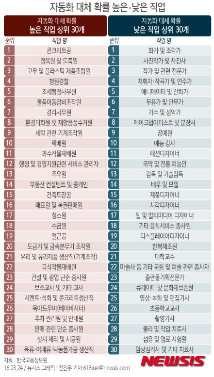 [스크랩] [흥미돋]반대로 가고있는 AI 대체 직업 확률 작성자난카이하바바|작성시간25.12.08|조회수60,698 목록 댓글 19 글자크기 작게가 글자크기 크게가 다음검색 스크랩 원문 : *여성시대* 차분한 20대들의 알흠다운 공간 현재 게시글 추가 기능 열기 북마크 공유하기 신고 센터로 신고 댓글 댓글 19 댓글쓰기 답글쓰기 댓글 리스트 작성자삥빵뿡빵삥 | 작성시간 25.12.08 사회복지사는 대체될라나...? 작성자룬룬이 | 작성시간 25.12.08 디자이너는 ai대체 쎌거같은데ㅜ 작성자귤에 붙어있는 | 작성시간 25.12.08 씨발..ㅠ뭐해먹고 살라고 작성자제쥬도고둥어회 | 작성시간 25.12.09 둘이 바뀐 거 아냐? 작성자VIVIZ엄지 | 작성시간 25.12.09 자동화랑은 다른듯. 근데 일단 로봇을 만들어야 하는 곳은 느릴거같아. 인간이 더 싸서 댓글 전체보기