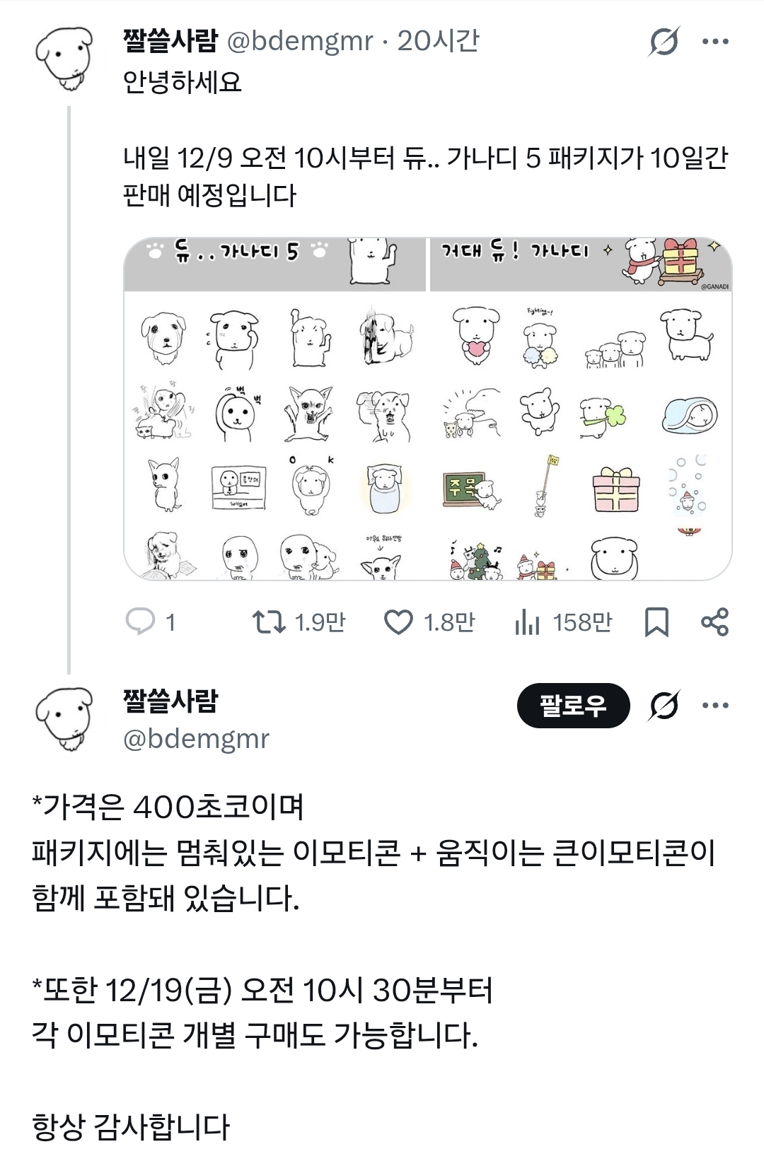 [흥미돋]듀.. 가나디 카카오톡 이모티콘 출시 (근데 패키지,,) 작성자김 재영|작성시간25.12.09|조회수11,544 목록 댓글 79 글자크기 작게가 글자크기 크게가 출처: https://x.com/i/status/1997911303781019996https://e.kakao.com/t/dyu-ganadi-5?t_src=emoticon&t_ch=webstore&t_obj=web_main_banner[패키지] 듀.. 가나디 5지금 핫한 인기 이모티콘부터 새로나온 신규 이모티콘까지! 언제나, 무엇이나, 누구나 할인받는 공간!e.kakao.com얘는 대왕버전 다음검색 현재 게시글 추가 기능 열기 북마크 공유하기 신고 센터로 신고 댓글 댓글 79 댓글쓰기 답글쓰기 댓글 리스트 작성자누리꽃 | 작성시간 25.12.09 작성자대굴레오 | 작성시간 25.12.10 샀지렁 작성자우리집공주강쥐 | 작성시간 25.12.10 작성자교촌허니 | 작성시간 25.12.12 작성자부에노스꽐라스 | 작성시간 25.12.13 댓글 전체보기