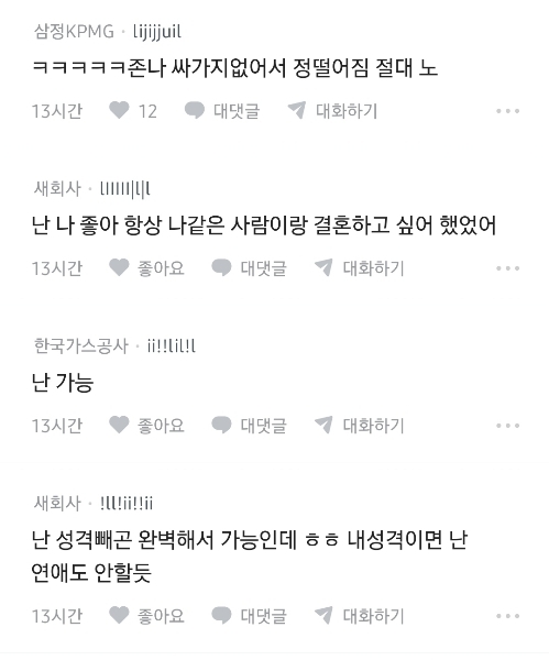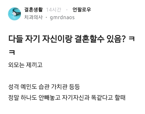 [흥미돋]다들 자기 자신이랑 결혼할 수 있음? 작성자이제추버요|작성시간25.12.09|조회수23,996 목록 댓글 612 글자크기 작게가 글자크기 크게가 출처: 여성시대 (이제추버요)블라 다음검색 현재 게시글 추가 기능 열기 북마크 공유하기 신고 센터로 신고 댓글 댓글 612 댓글쓰기 답글쓰기 댓글 리스트 작성자지금여기서행복할것 | 작성시간 25.12.10 노... 너무 게을러 작성자Pado | 작성시간 25.12.10 너무 좋을 듯 작성자아웅 추카추카 | 작성시간 25.12.10 못함 존나예민해서 작성자만순잏 | 작성시간 25.12.10 노 작성자baijingting | 작성시간 25.12.11 ㅇㅇㅇ… 댓글 전체보기