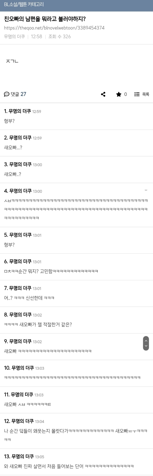 [흥미돋]친오빠의 남편을 머라고 부르지? 작성자야호우|작성시간25.12.09|조회수51,809 목록 댓글 124 글자크기 작게가 글자크기 크게가 출처: 여성시대(이제추버요)더쿠벨친자의 고민 다음검색 현재 게시글 추가 기능 열기 북마크 공유하기 신고 센터로 신고 댓글 댓글 124 댓글쓰기 답글쓰기 댓글 리스트 작성자4일 기차예매 | 작성시간 25.12.10 새오빸ㅋㅋㅋ 작성자계훈계훈 | 작성시간 25.12.10 친오빠가 공인지 수인지 알아야 답댓글 작성자계훈계훈 | 작성시간 25.12.10 근데 친오빠면 걍 약오르라고 상대방 형부라고 부를듯 작성자구찬성 | 작성시간 25.12.10 새오빠 ㅅㅂ ㅋㅋㅋㅋㅋㅋ 작성자천재적인 바보 | 작성시간 25.12.10 새오빠 ㅋㅋㅋㅋㅋㅋㅋㅋㅋ 댓글 전체보기